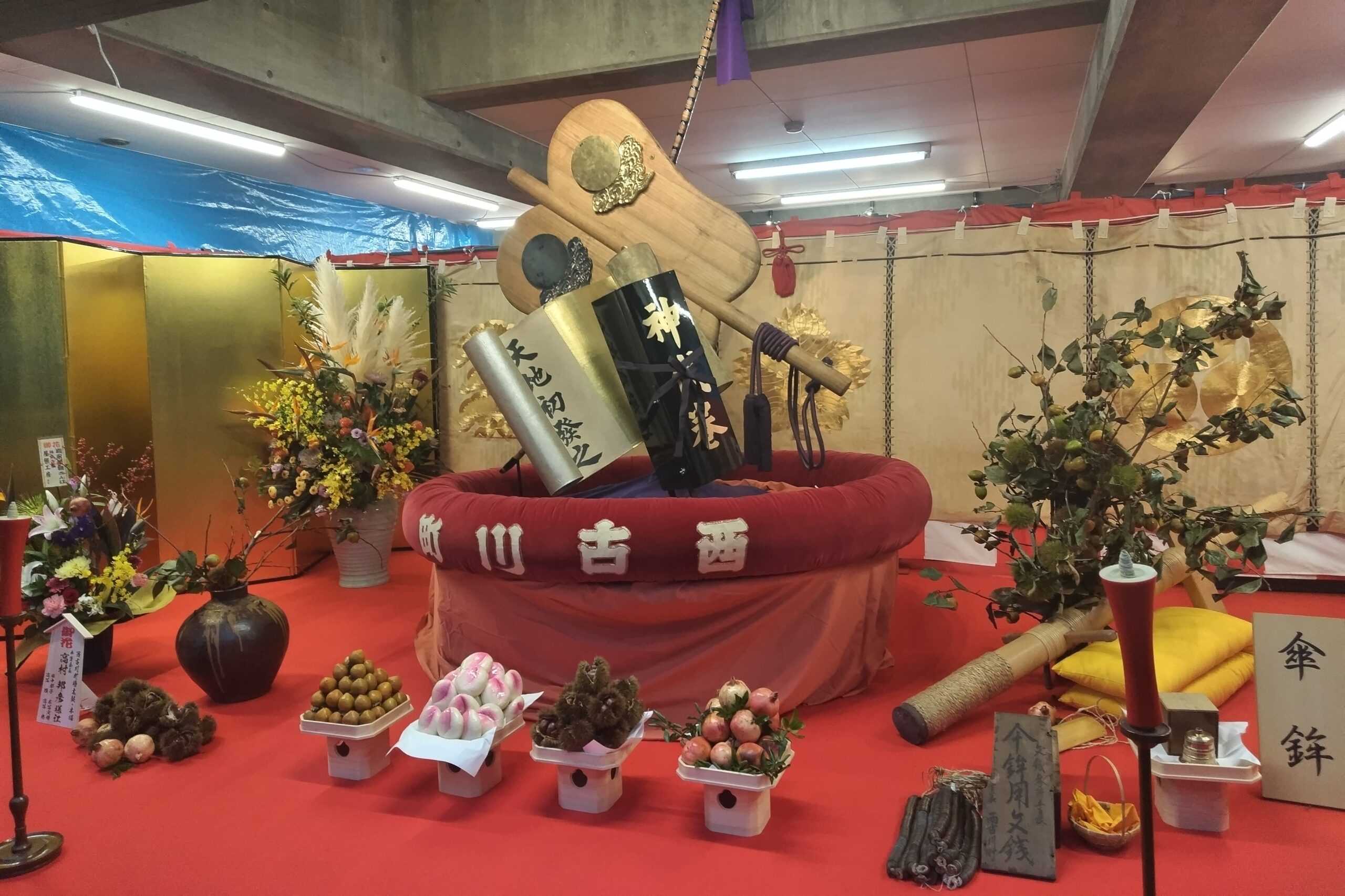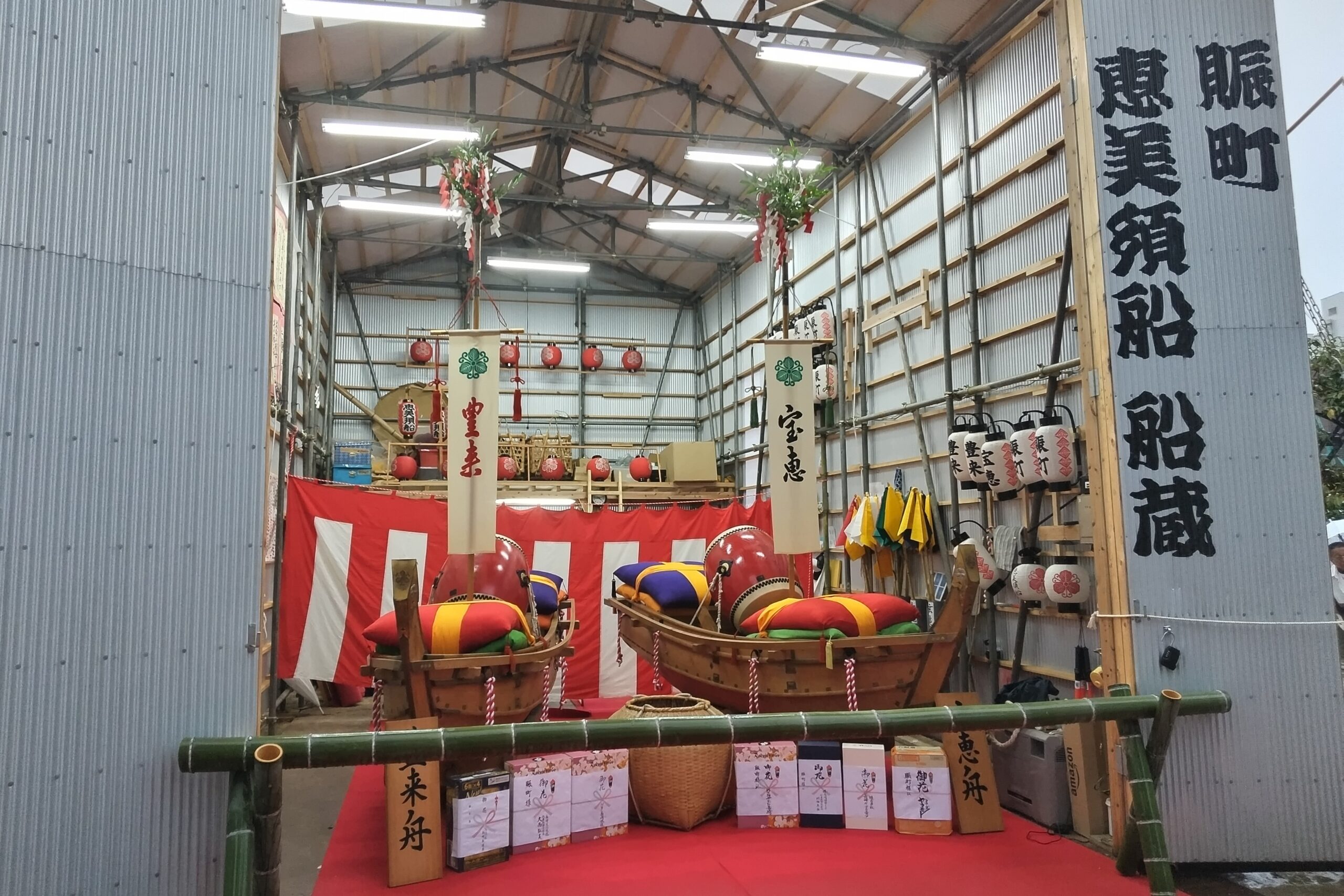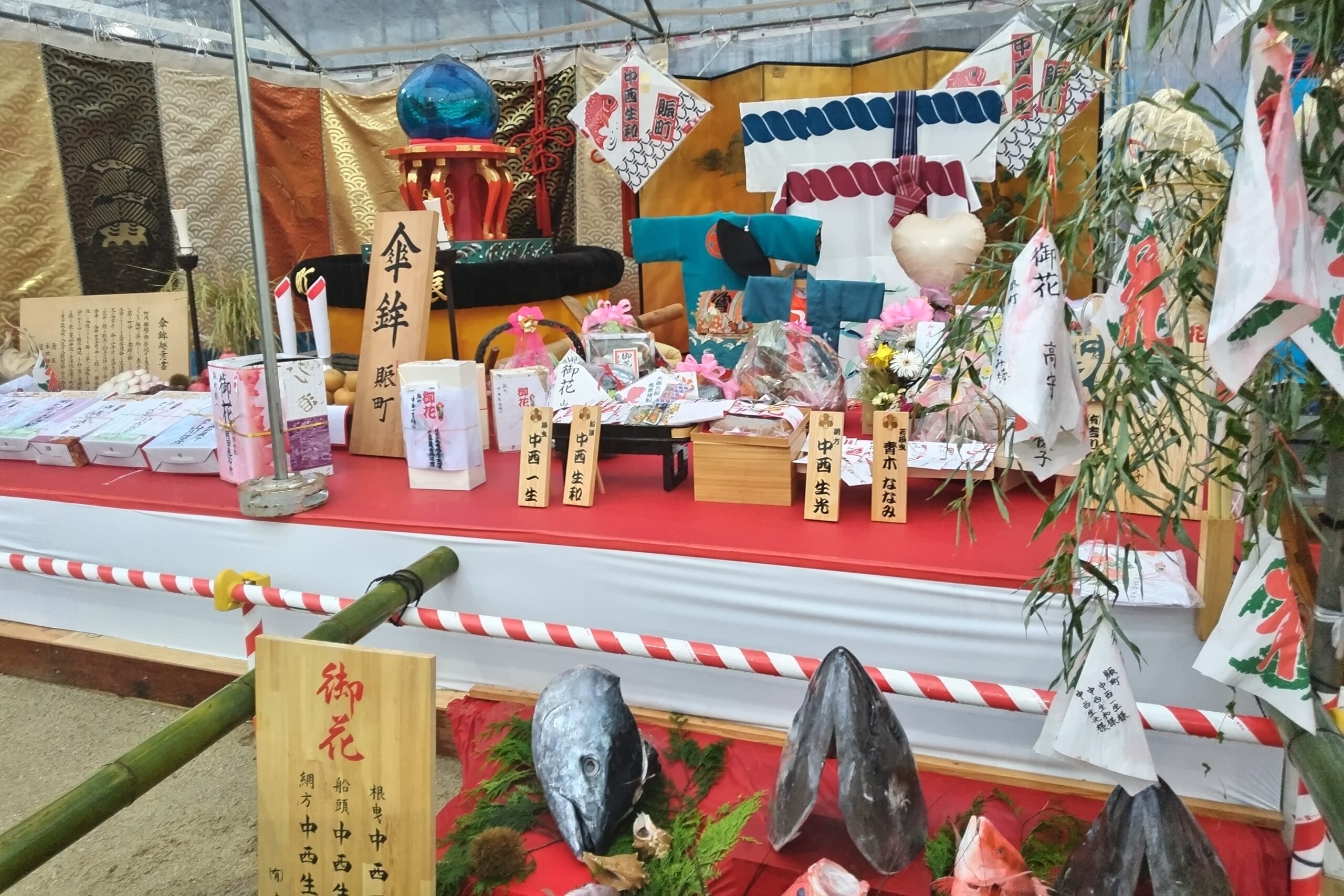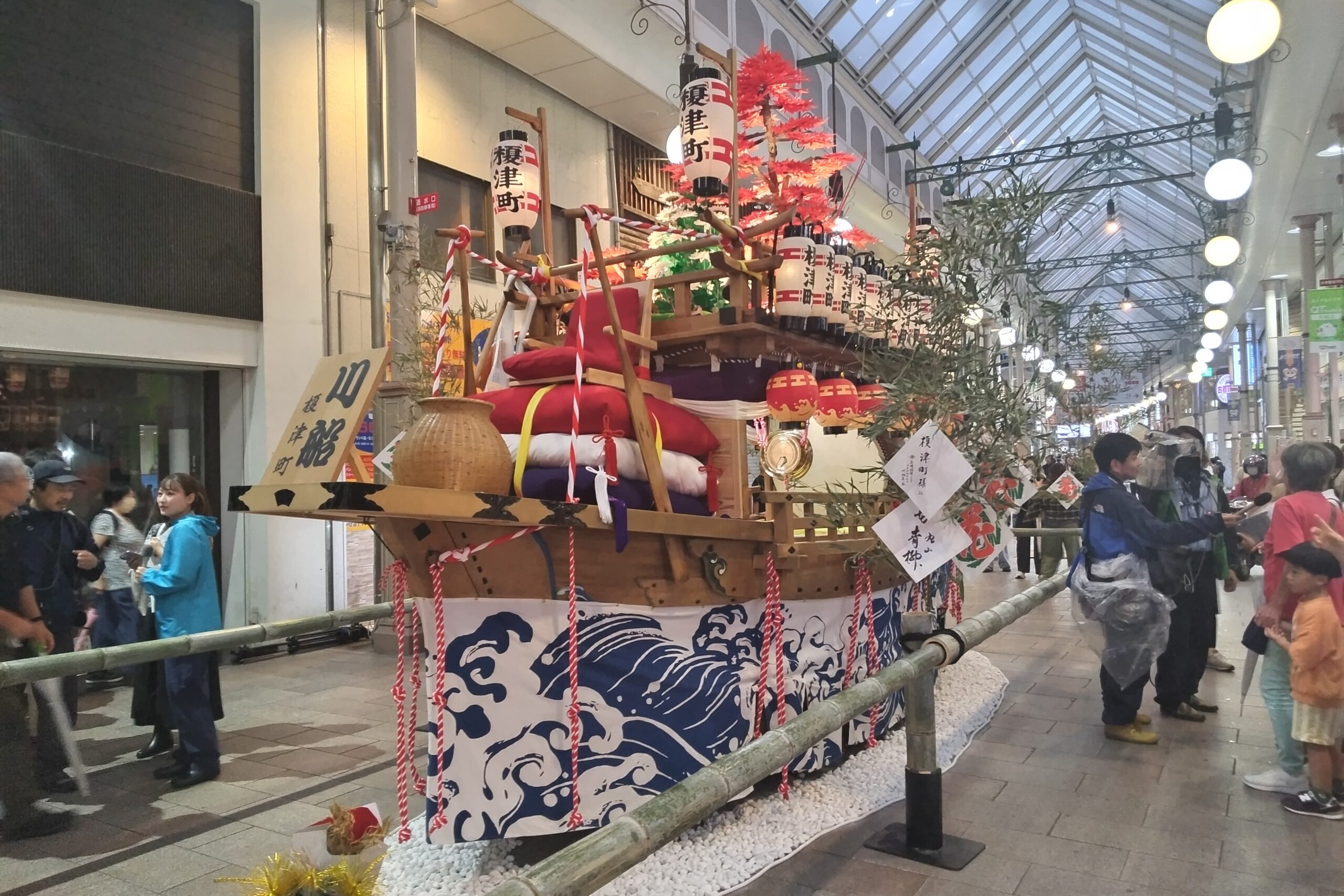 今年の踊町と演(だ)し物は、西古川町「櫓太鼓・本踊」、新大工町「詩舞・曳檀尻」、諏訪町「龍踊」、榎津町「川船」、賑町「大漁万祝恵美須船」、新橋町「本踊阿蘭陀万歳」の6町が奉納する。10月3日は小雨模様の中、賑町の中央公園から万屋町ベルナード観光通りを経由して新地中華街まで散策した。散策の目的は、各踊り町が本番で使う衣装や傘鉾(かさぼこ)、小道具・楽器などが飾られているものや、踊り町の出演者に贈られた祝品を並べて披露する「庭見せ」を見学した。「庭見せ」に目を奪われるものは、衣装はもちろんではあるが、祝品は大きな鯛や伊勢海老、おおきなざくろ・柿・栗など飾られ、本格的な秋の訪れを感じた。賑町の中央公園では17時前から、足元が悪いなかでも多くの人が訪れ賑わい、ベルナード観光通りでは「川船」展示の周辺に観光客や市民らがスマートフォン片手に撮影を行っていた。観光通りはくんちムードが漂い、くんちを通じて地域の活性化が期待される。