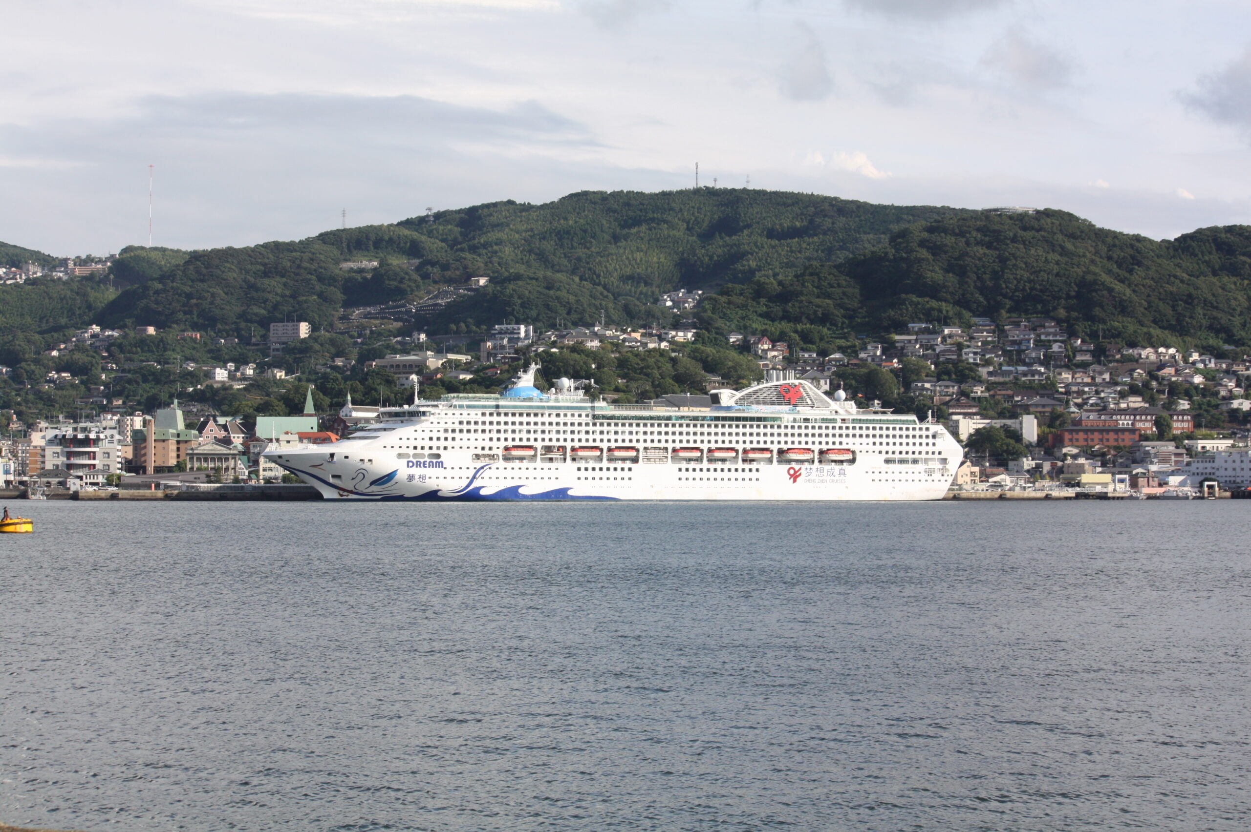 9月24日に寄港した”ドリーム“船籍はリベリア、総㌧数77,499㌧、全長261.1㍍、全幅32㍍、乗客定員2,272人、乗組員数850人、天津(中国)から松が枝(長崎)へ、そして済州島(韓国)へ向う。このクルーズは、乗客の多くは中国人ですが、欧米の方も乗船しているという。