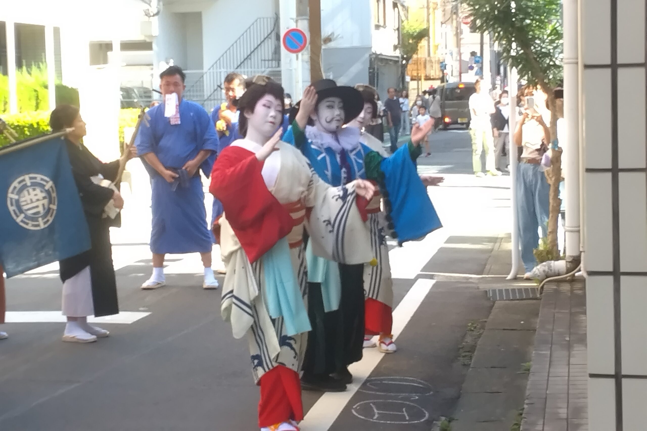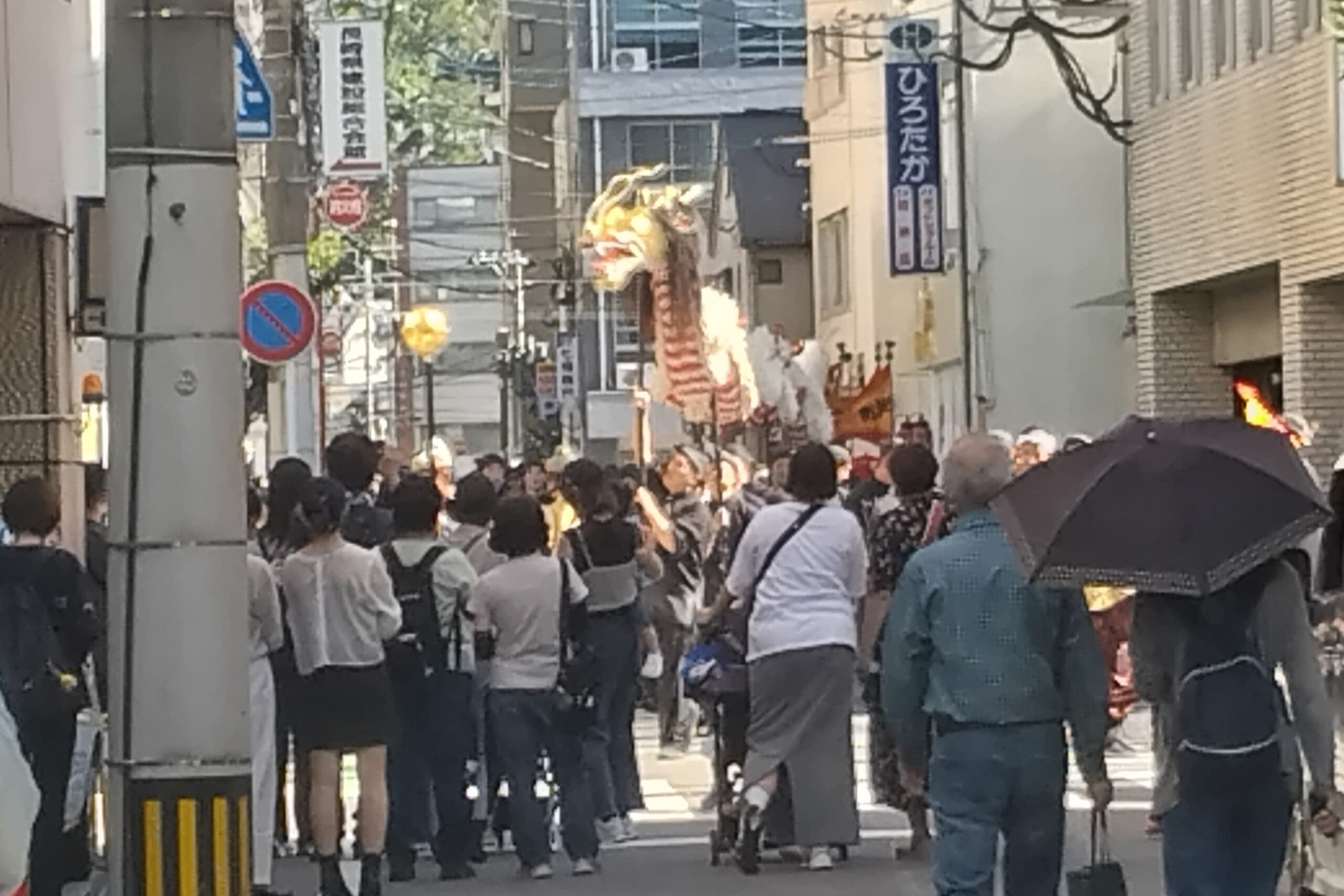 諏訪神社の秋の大祭「長崎くんち」は「後日」の9日、諏訪、住吉、森崎のみこしをお旅所(元船町)から同神社へ戻す「お上り」があり、3日間の幕を閉じた。後日(9日)は、井上重久だよりの校了を終えて、支援企業・労組への配布事前準備、後援会員への郵送準備など済ませ、市役所議会控室に所用のため移動した。その際、タイミングよく庭先回りの新橋町の阿蘭陀万歳、諏訪町の龍踊の一行に出会った。道路沿いには、会社関係の人や、見物客らが大勢集まり、スマートフォン片手にシャッターを押し、盛大な拍手がおくられていた。庭先回りは、市内の事業所や官公庁、各家庭などに、敬意を表して踊りを呈上することで福をお裾分けし、お祝いするという趣旨のもので、踊町は短い踊りやお囃子を玄関先や店先、門前等の路上で演じられていた。