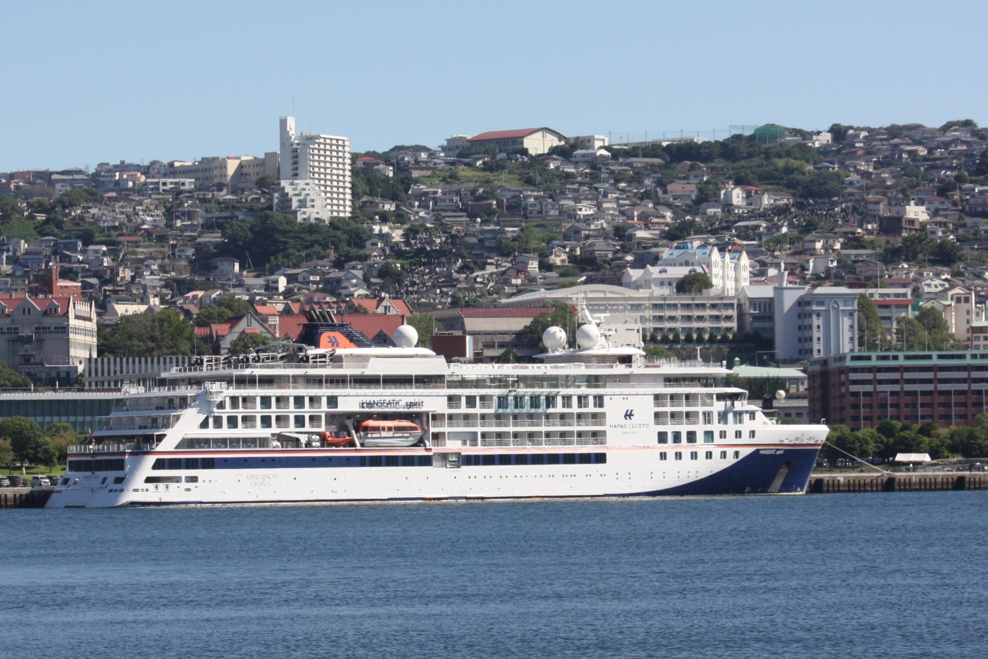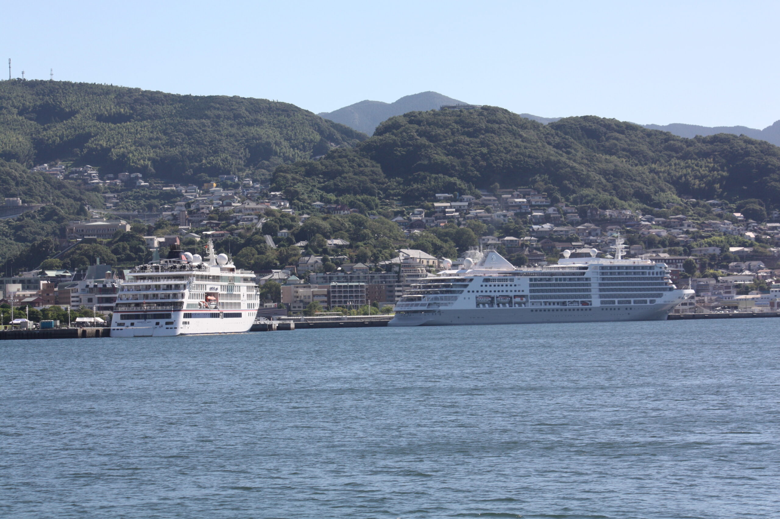 次に、10月9日にダブル寄港した、独ハパク・ロイド・クルーズの新造探検客船“ハンセアティック・スピリット”船籍はマルタ、総㌧数15,651㌧、全長138.8㍍、 全幅22.0㍍、旅客定員230人、乗組員数170人、韓国(済州島)から長崎(出島、一泊)へそして秋田(上飯島)へ向う。また、10月9日にダブル寄港した“シルバー・ムーン” 船籍はバハマ、総㌧数40,844㌧、全長212.8㍍、全幅27㍍、旅客定員596人、乗組員数411人、デッキ数8階層、韓国(釜山)から長崎(松が枝)へそして鹿児島へ向う。