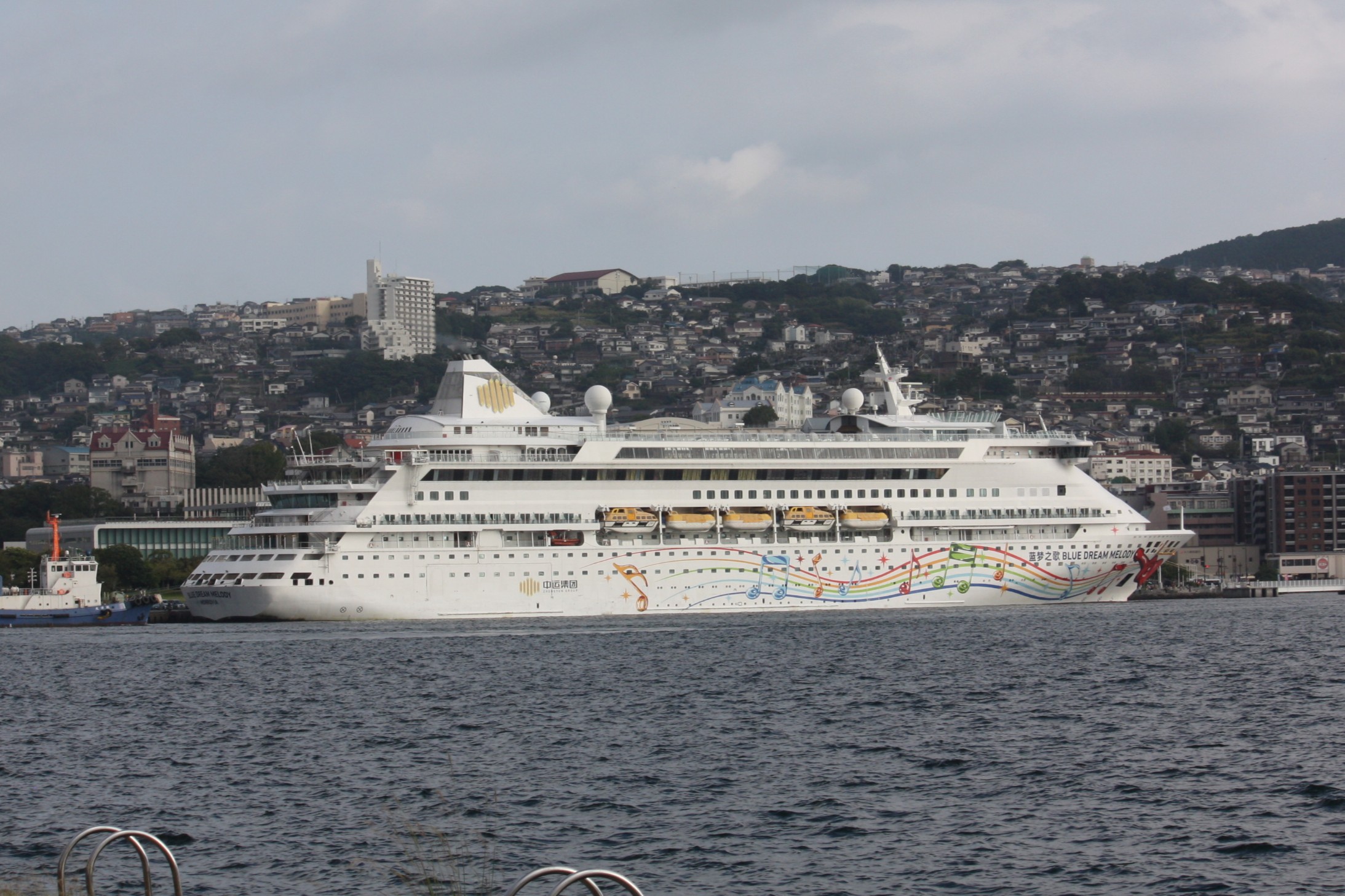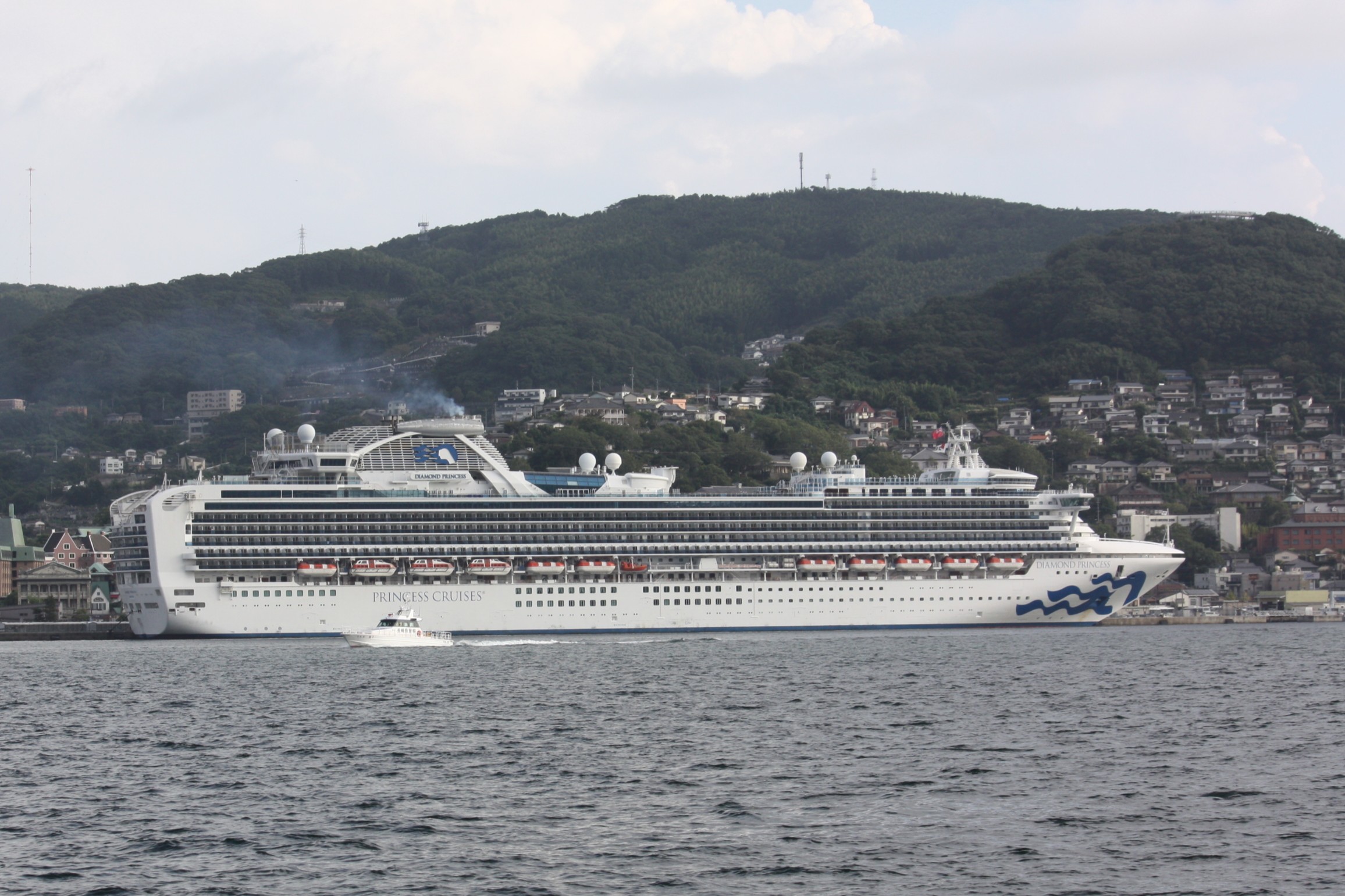 10月の長崎港へのクルーズ寄港は22隻、そのうちダブル寄港は3回の予定となっている。先ず、10月14日に寄港した“ダイヤモンド・プリンセス”船籍はイギリス 、総㌧数115,906㌧、全長290㍍、全幅37.5㍍、高さ54㍍、デッキ数18層、旅客定員,706人、乗組員数1,238人、韓国(釜山)から長崎(松が枝)へ、そして神戸へ向かう。このダイヤモンド・プリンセスは、米国に本拠地があるカーニバル・コーポレーション傘下のプリンセス・クルーズ社が運航、同型の姉妹船にサファイア・プリンセスがある。三菱重工業長崎造船所で艤装工事中に火災が発生、同時建造していたサファイア・プリンセスを急遽、新「ダイヤモンド・プリンセス」として引き渡されている。