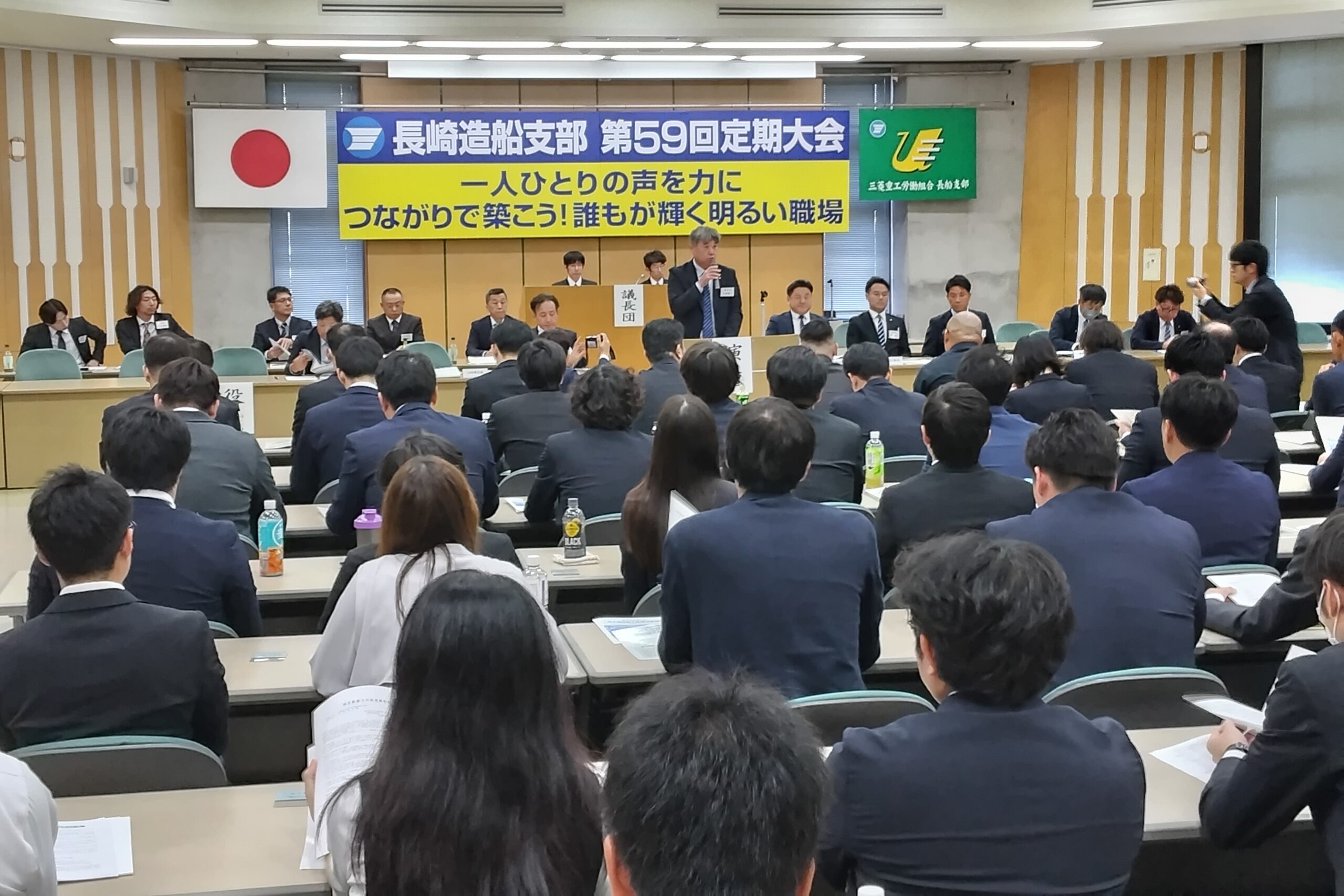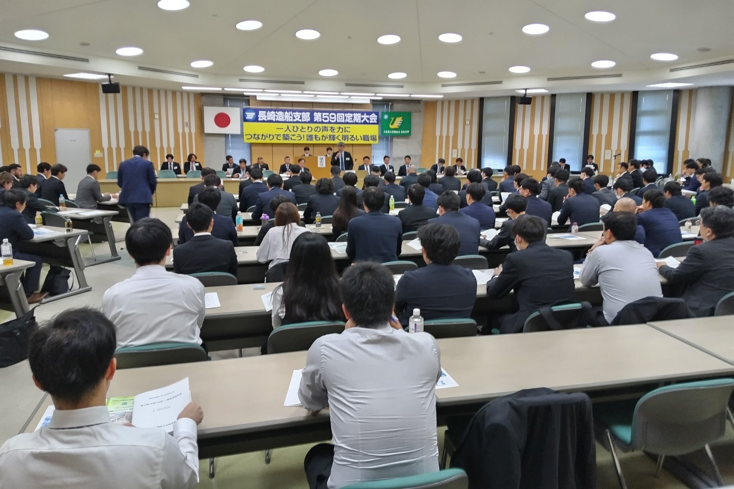 三菱重工労働組合長崎造船支部(寺脇克典執行委員長)は、10月24日(金)14時から長船支部労働会館において162名の代議員、来賓らが出席するなか「三菱重工労働組合長崎造船支部第59回定期大会」を開催した。開会冒頭、この一年の間に志半ばで亡くなった組合員に対し黙とうを捧げ、寺脇執行委員長よりこれまでの連合会から単一組合として改めて再スターした。長船支部の重点課題は、①「安全を全てに優先させる」安全職場確立で死亡・重大災害の撲滅。②新たな組織体制(4専門部から2部局制へ)における諸活動のチェック・フォロー。③会社諸施策への的確な対応と2024事業計画のチェック・フォロー。④組合員の生活改善を念頭においた年間総賃金の安定的確保と福利厚生の充実。⑤統一地方選挙をはじめとする政策実現推進活動の確実な展開など5点についての見解が示された。