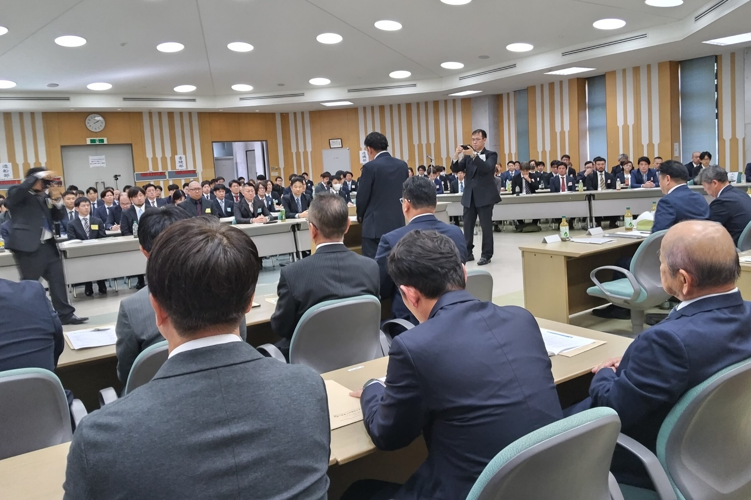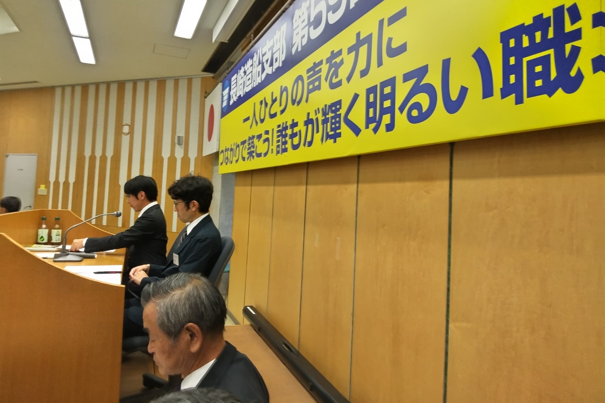 来賓挨拶では、重工労組本部大谷副執行委員長より「安全衛生方針における重大災害撲滅、年間総賃金の向上と65歳現役社会の実現に向けた労働環境の構築など」、連合長崎岩永会長より「春季生活闘争、政治活動の推進など」、生活相談室中村室長より「日常活動に対するお礼、政策の実現に向けてなど」連帯の挨拶があった。三菱重工労組長船支部は、昭和40年12月7日2007名の勇気ある諸先輩の決断により左翼的労働運動から決別し、真面目に働く者が報われる民主的労働運動の道を歩む、新生長船支部が結成され60周年を迎える。次代は大きく変革しているが、結成60周年を機に原点を振り返る機会に、関係先との一体感、安全と健康、仲間と家族の命と生活を守る取り組みに注力してほしい。