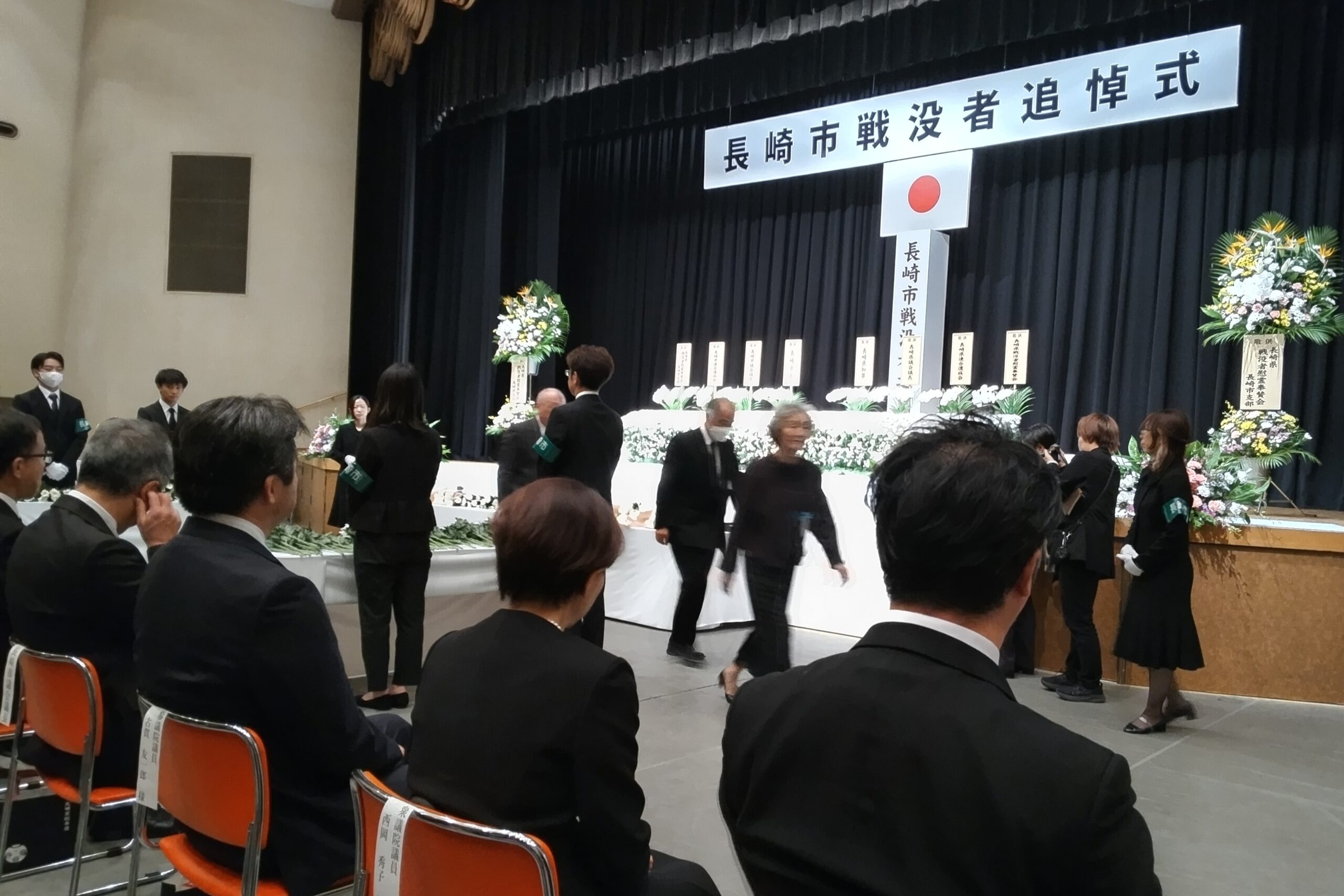 長崎県戦没者慰霊奉賛会長崎支部(鈴木史朗支部長)は、11月1日(土)14時から平和会館ホール(平野町)において遺族会・連合自治会長・関係団体から約200名が出席し、「令和7年長崎市戦没者追悼式」を執り行った。追悼式では、遺族を代表して3人が献花台に花を手向け、参列者全員で黙とうを捧げた。鈴木支部長より「終戦から80年尊い命を捧げた事は忘れえぬ、深い悲しみ・苦しみを乗り越えてきた。こん日の発展がある事を後世に引き継がねばならない」、遺族会代表より「今こそ戦争の悲惨さと平和の尊さを次の世代へと語り継がなければならない」と述べられた。異国の地等で亡くなられた戦没者の御霊に対し、私も人類の平和と幸せを願いながら祭壇に献花した。(式典前にクスノキ、長崎の鐘、ふるさとの3曲、メモリーズによる追悼演奏が行われた)