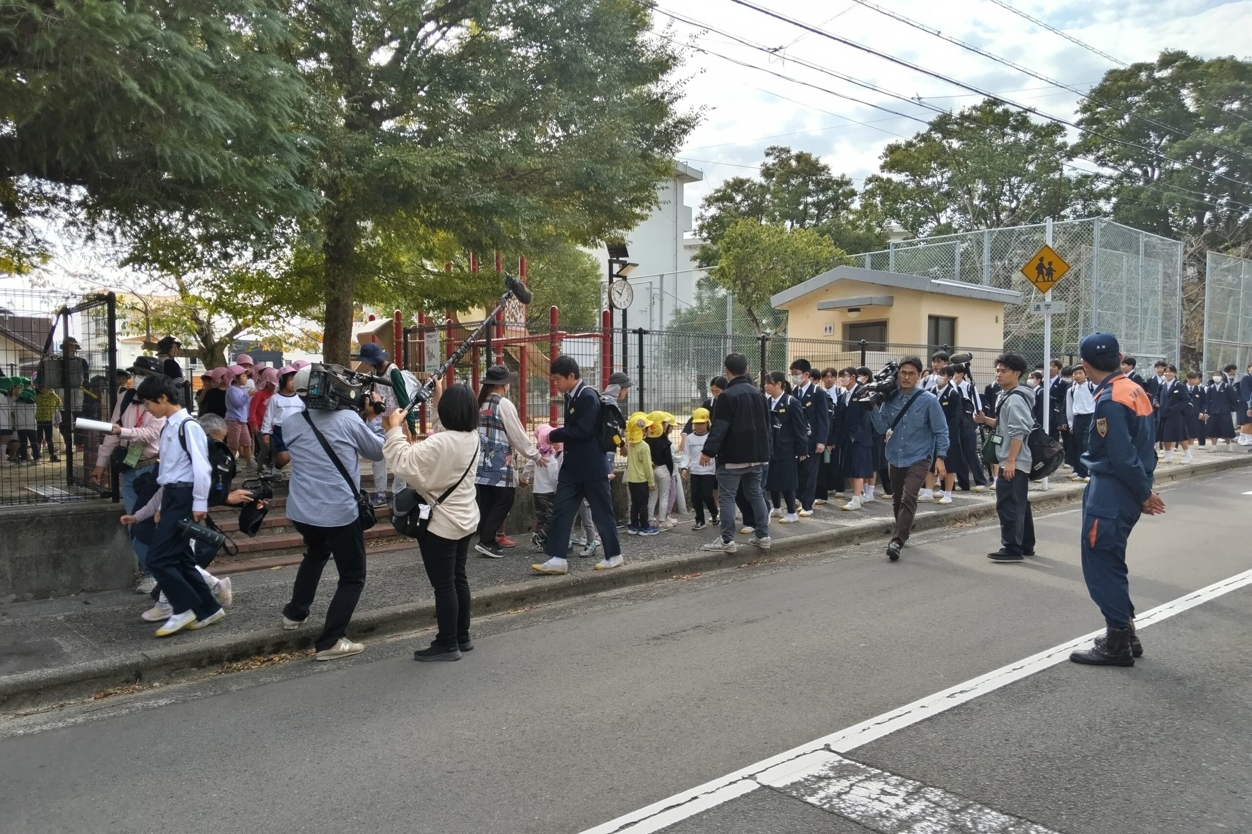 長崎市立福田中学校(高田浩一校長)は、11月4日(火)福田中学校の生徒や、福田こども園の園児、福田小学校区コミュニティ連絡協議会(自然・環境部会)、自治会関係者、長崎市消防局、長崎市教育委員会の関係者ら約300人が参加して「福田中学校津波避難訓練」を実施した。福田中学校は、文部科学省の「学校安全総合支援事業」のモデル校の指定を受け、学校における実践的・実効的な安全教育を推進することで、自他の命を守るための防災教育に取り組んでいる。津波避難訓練は、震度5強の地震が発生し、1㍍の津波がくることを想定、福田こども園の合同訓練は初めて実地、避難経路を確認するとともに地域の人との連携を図った。東日本大震災を踏まえ津波対策への理解を深めてもらおうと、11月5日「津波防災の日」の前日に実施された。