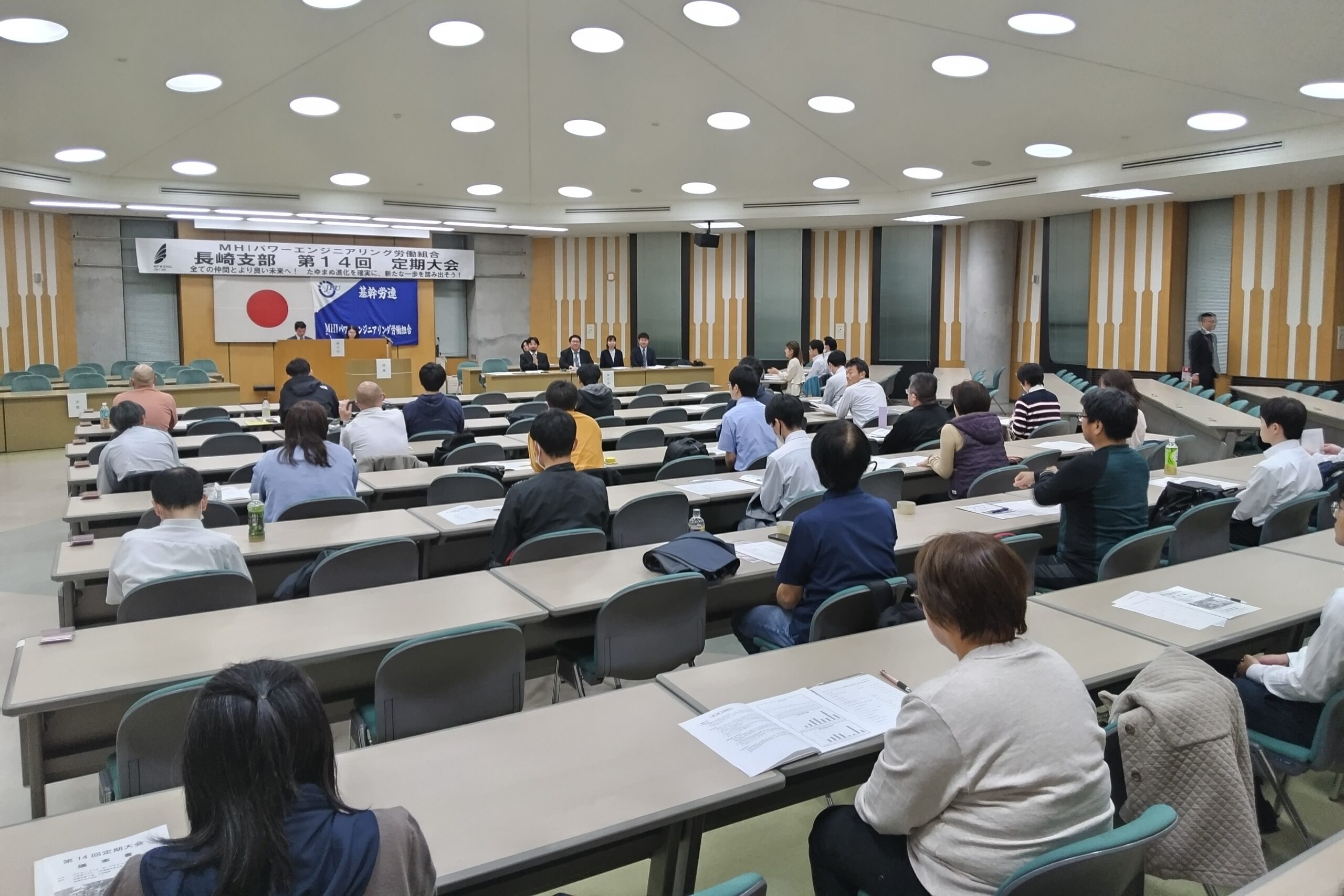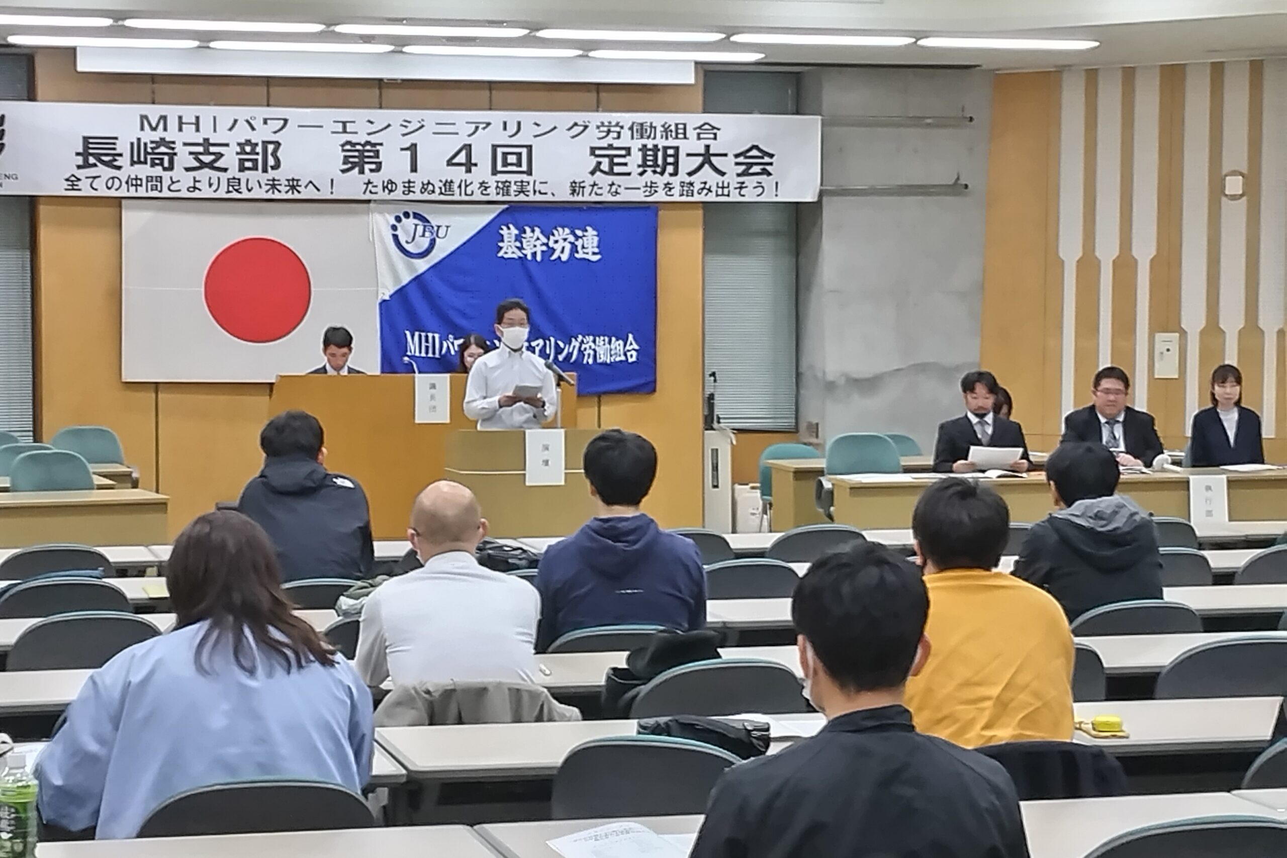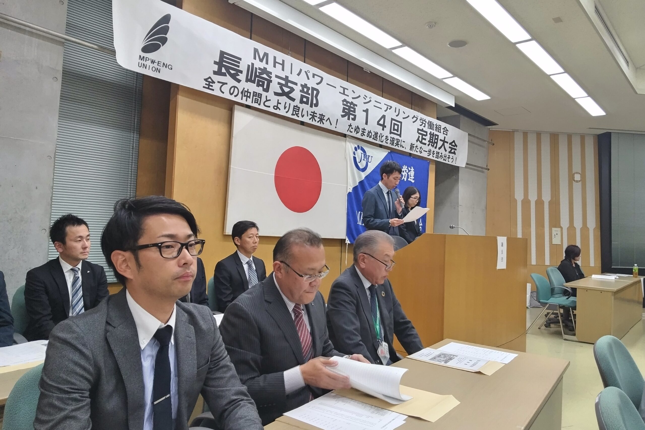 MHIパワーエンジニアリング労働組合長崎支部(森下卓執行委員長)は、11月7日(金)18時から三菱重工労組長船支部労働会館において大会代議員・来賓らが出席して「MHIパワーエンジニアリング労働組合長崎支部第14回定期大会」を開催した。開会冒頭、森下執行委員長より「受注・総業とも計画地を達成出来たが、エネルギー価格の高騰、人材費も含むコスト増、脱炭素・カーボンニュートラル社会への以降等、めまぐるしく変化している。お客様のニーズに応える“エンジニアリング能力の更なる向上”各種コミュニケーションツールを活用しながら組織の維持・強化に努める。参議院選挙では比例区の郡山りょう氏は当選、選挙区の深堀浩氏は残念な結果となった。組合活動の原点は面着による対話活動であることを意識し、アクティブプランの取り組みや会社提案への対応など、直実に行っていく」との挨拶があった。