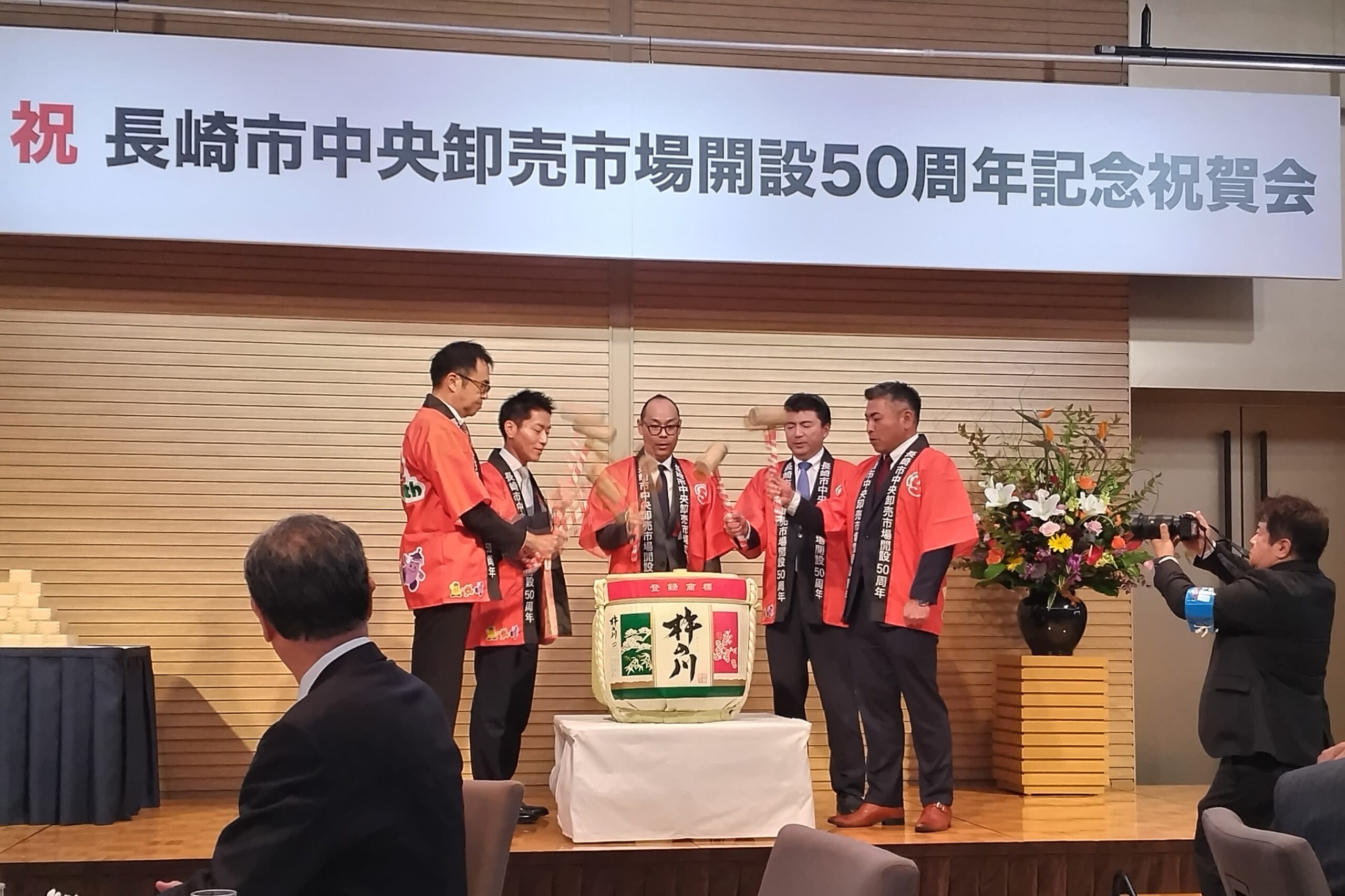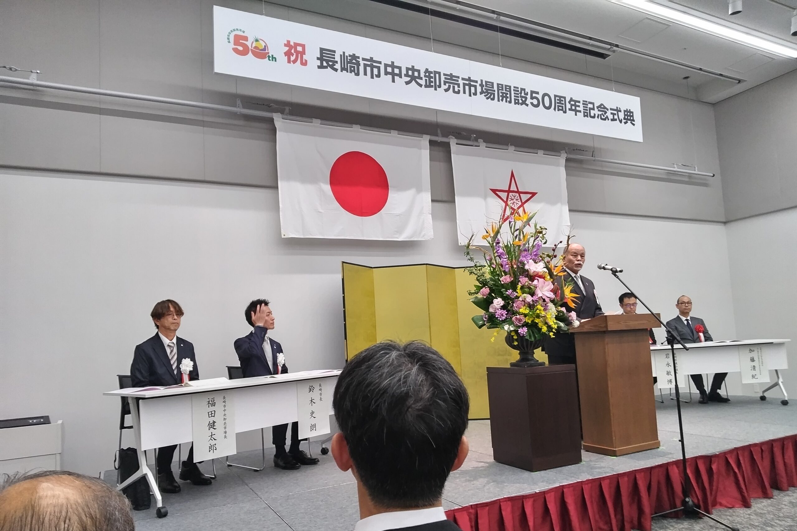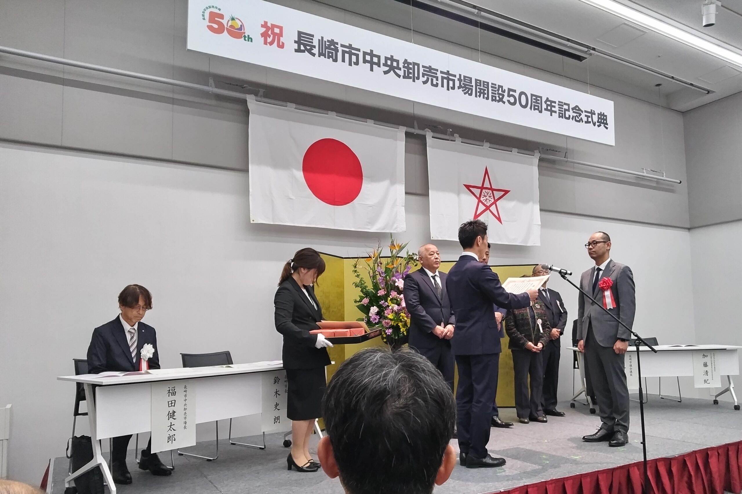 長崎市・長崎市中央卸売市場開設50周年記念事業実行委員会は、さる11月9日(日)出島メッセ長崎において「中央卸売市場開設50周年記念式典」を、ヒルトン長崎で「市場開設50周年記念祝賀会」をそれぞれ開催した。長崎市中央卸売市場は、昭和50年7月の開設以来、半世紀にわたり長崎市民の食生活を支え、地域経済の発展に大きく貢献してきた。本市場は、県内及び県外からの良質な食材の流通拠点として、「食の安全・安心」を守る役割を果してきた。しかしながら、人口減少や生産量の減少、流通構造の多様化、生産者の後継社問題、価格競争など、市場を取り巻く環境は厳しさを増している。これからも持続可能な市場運営を目指し、卸売市場としての安全安心な青果物の安定供給にご尽力願う。
