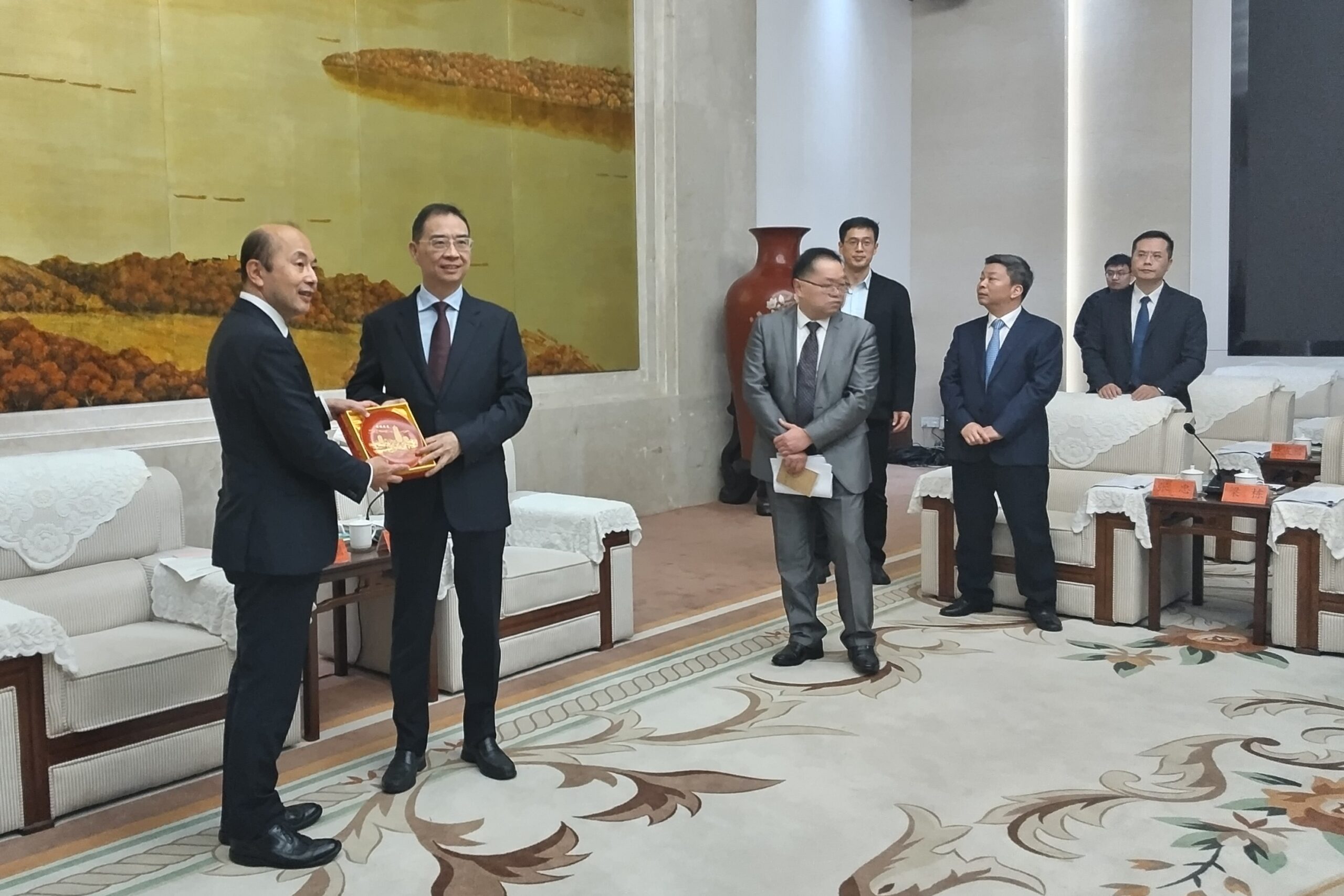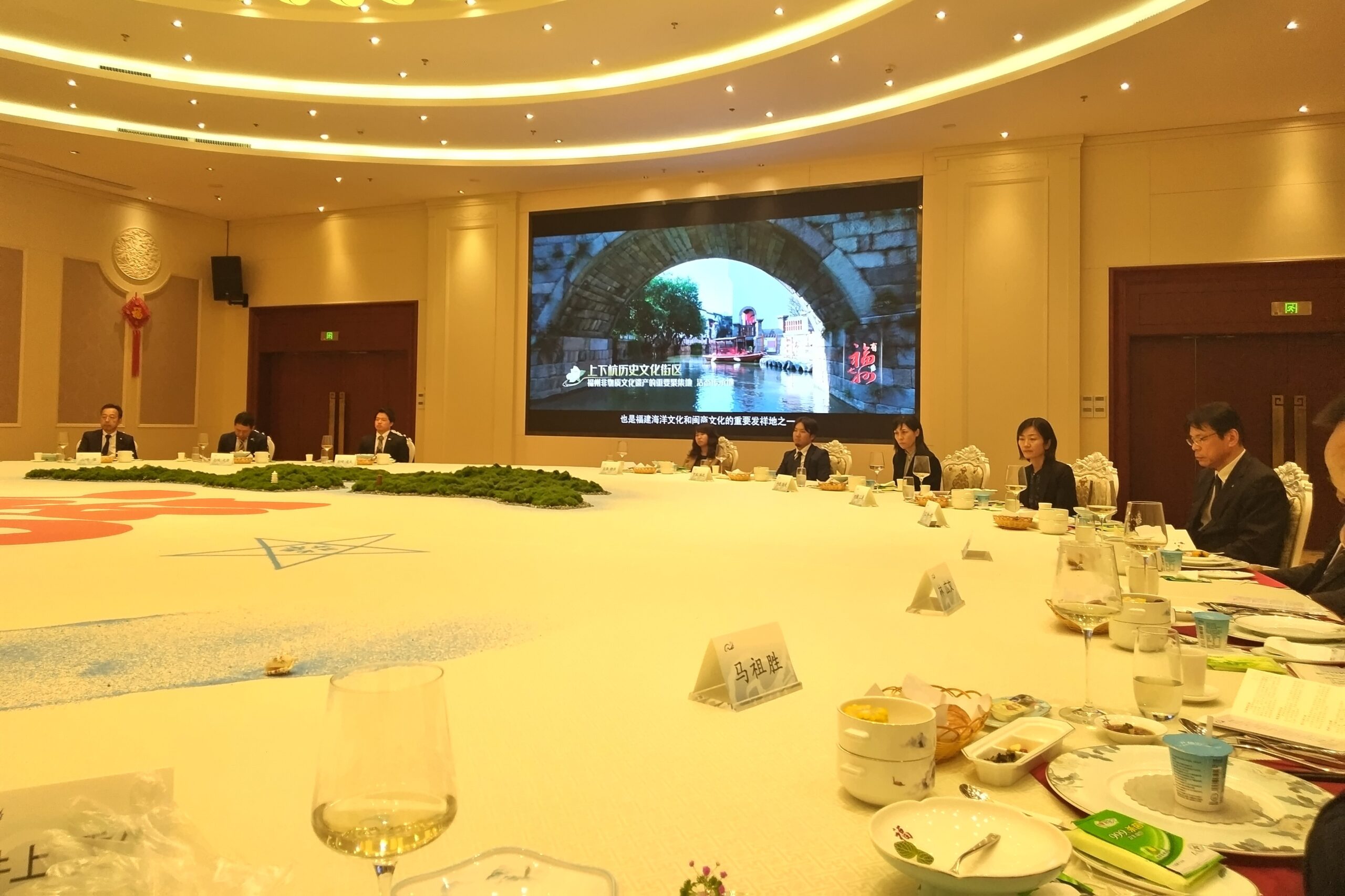 併せて、三坊七巷視察後、福州市が所有する迎賓館と思われる会場で福州市長を表敬訪問した。呉賢徳(ごけんとく)福州市長より「人口は約850万人、面積は約1万2千平方㎞、緑の街、経済発展の街、海のシルクロード、歴史文化都市として現在に至るなどの概況説明。両市では昔から多くの分野で交流が深まっており、公式訪問団を歓迎し友好関係を築いていきたい」、鈴木史朗長崎市長より「長崎市には福州出身の華僑が多く大切なパートナーであり、友好都市締結45周年を記念して訪問した。これまでも水産・下水道関係の交流、ランタンフェスティバル、ペーロン、中学生の交流など行った、50年先も繋がるよう友情を育んでいこう」との挨拶があり、双方からそれぞれメンバーの紹介や記念品の交換があった。その後、同施設の別会場で、福州市主催の歓迎夕食会が開かれ、最高のおもてなしを受けた。