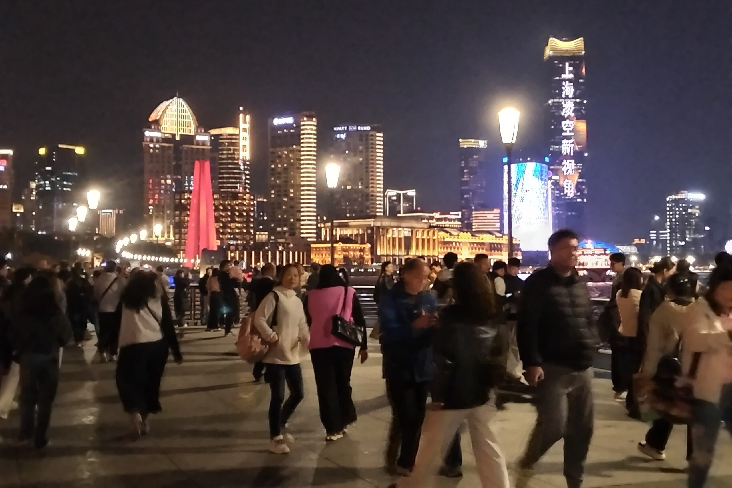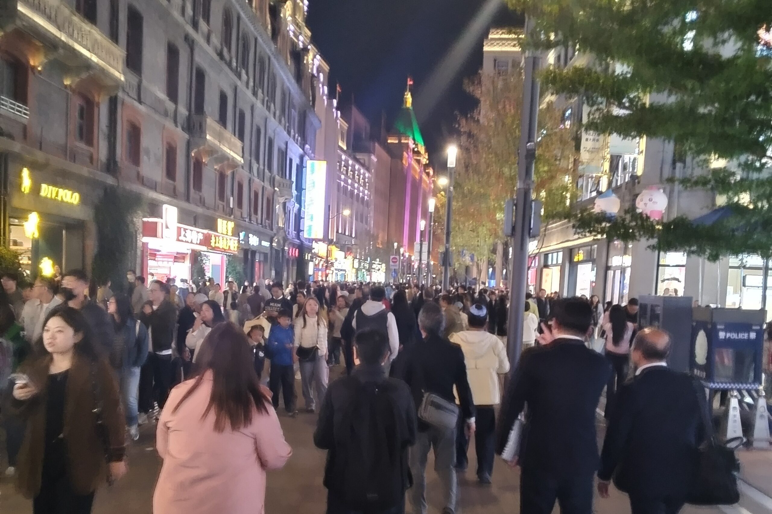 併せて、11月14日(視察4日目)夕食後、上海市中心街の南京路を散策した。南京路は上海最大の繁華街、全長約5.2㎞の通りで老舗の百貨店や食品店を中心に、近代的な老舗が並ぶ南京東路と、高級ホテルやショッピングモール、喫茶店やレストランが多い南京西路に分かれていると言うが、散策していてもどこに向っているのか分からず、現地ガイドについて行くだけだった。10年前の公式訪問でも訪れたことがあったが、前回は昼間の散策、今回はライトアップ、ネオン、イルミネーションが鮮やかな夜景見学のため、人通りの多さと夜景の魅力を堪能した。