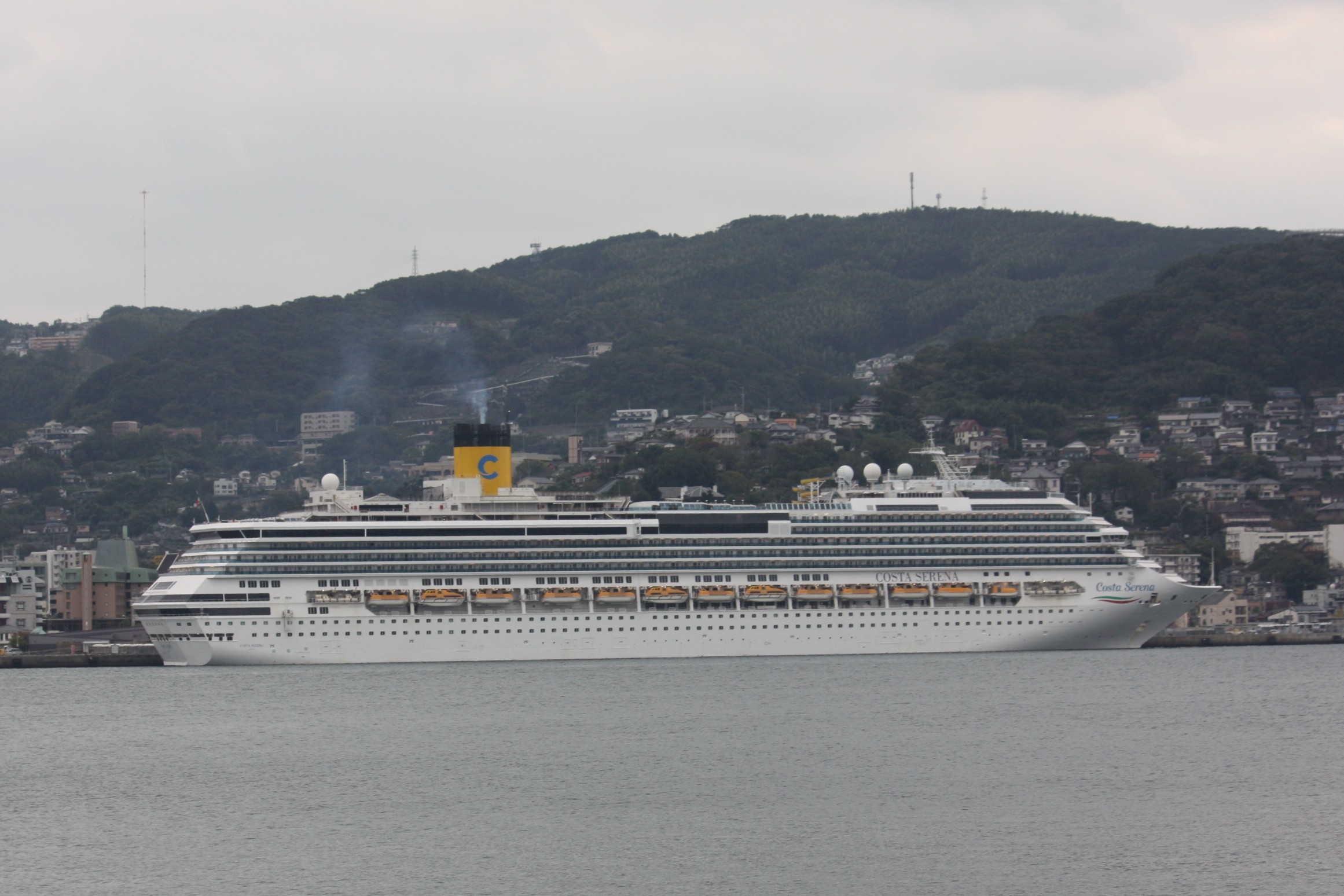 また、11月18日に寄港した“コスタ・セレーナ”船籍はイタリア、総トン数114,261㌧、全長290.2㍍、全幅35.5㍍、乗客定員3,780人、乗組員数1,100人、八代から長崎(松が枝)へ、そして韓国(基隆)に向かう。コスタ・セレーナは、イタリアに本社を構えるヨーロッパ最大の「コスタクルーズ社」、現在15隻の大型客船を保有し1948年からの歴史を持ち、ヨーロッパのクルーズ市場を牽引してきたという。日本発着のクルーズも予定されている。船籍についてはその名の通り、船舶の籍のことで、人で言うところの戸籍に相当する。船舶登録料・税金の安い国、規制のゆるい国のほか、政治の安定した国、評判の良い国、船の産業を支えてくれる国など、船籍国として多く選ばれているという。