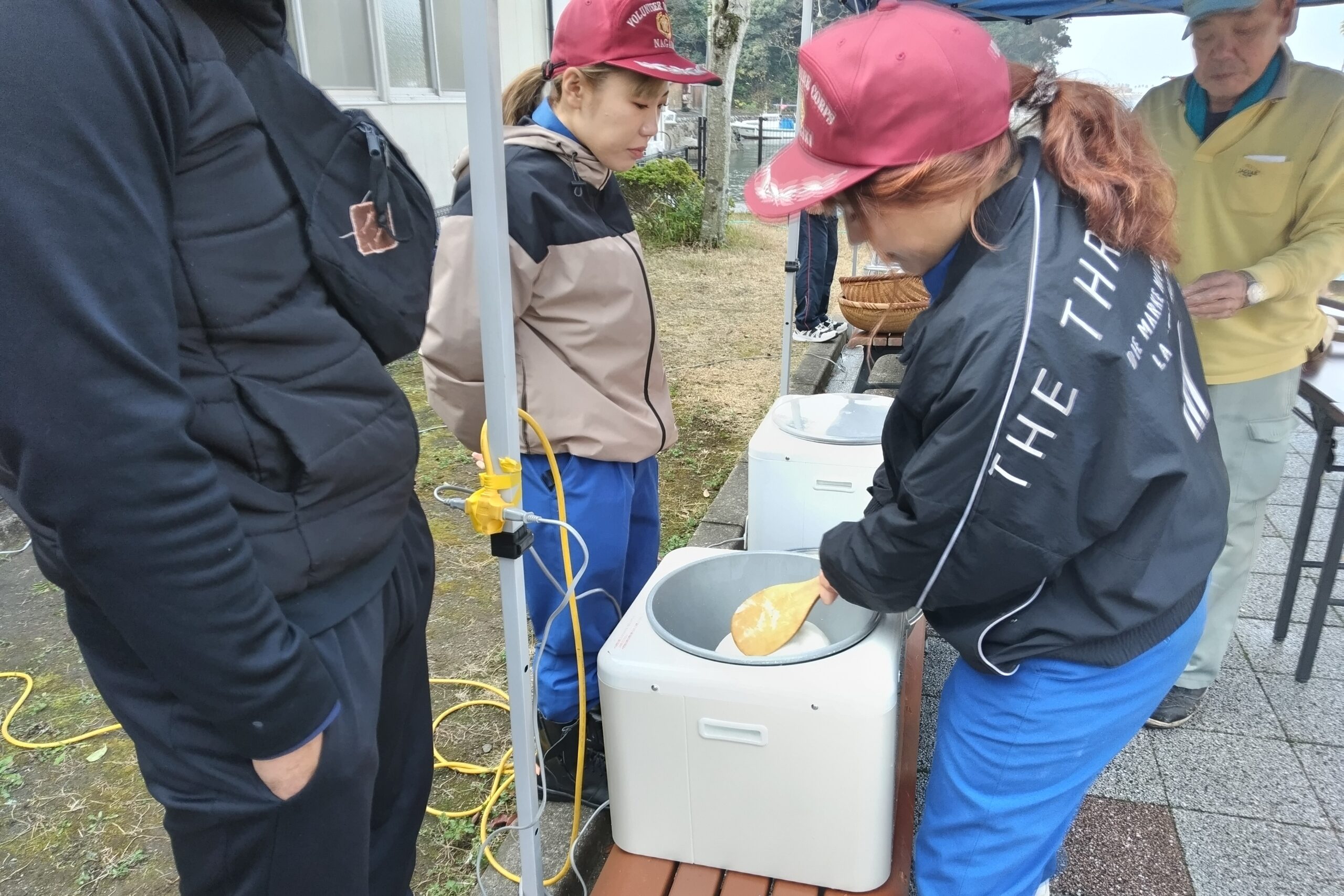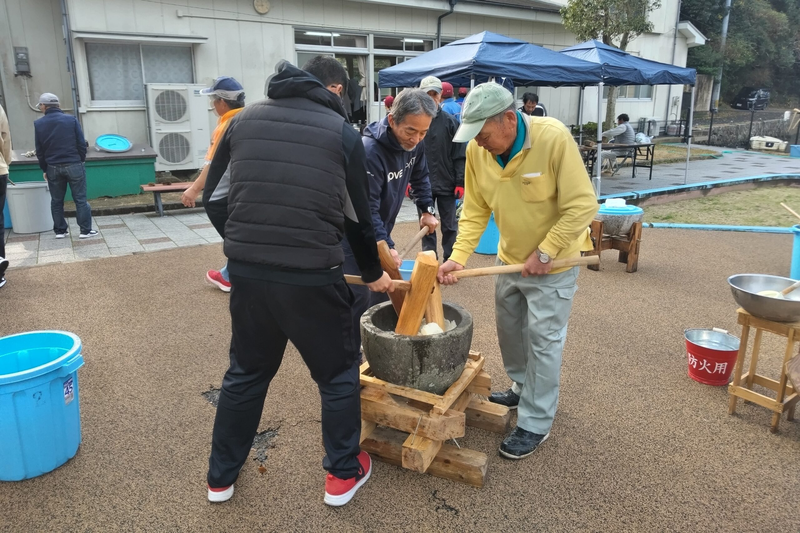 大浜町自治会は、12月21日(日)9時から大浜公園において地域住民参加のもと「大浜町自治会年末餅つき大会 」を行った。このもちつき大会は、自治会内の大人や子ども達の親睦・交流を図り、地域の絆をつくろうと自治会行事として開催している。大浜公園では、早朝から自治会役員、消防団、ペーロン保存会、東西鶴寿会、子ども会ら多数の参加のもと、「イチ・ニ・サン、イチ・ニ・サン」の掛け声とともに、55kのもち米をつきあげ、参加者の皆さんにつきたての餅を配布した。町内会も高齢者の増加に伴い、もちっこ機2台の活用と昔ながらの杵で餅つきを行った。地域の皆さんを中心に慣れた手つきで餅がつかれ、餅のつきかたが子ども達に伝授されていた。また、公民館では役員・ボランティアの婦人部を中心に、あんこ餅や食べやすい大きさに餅をまるめていた。(同日、社協立神支部も餅つき大会が開かれた)