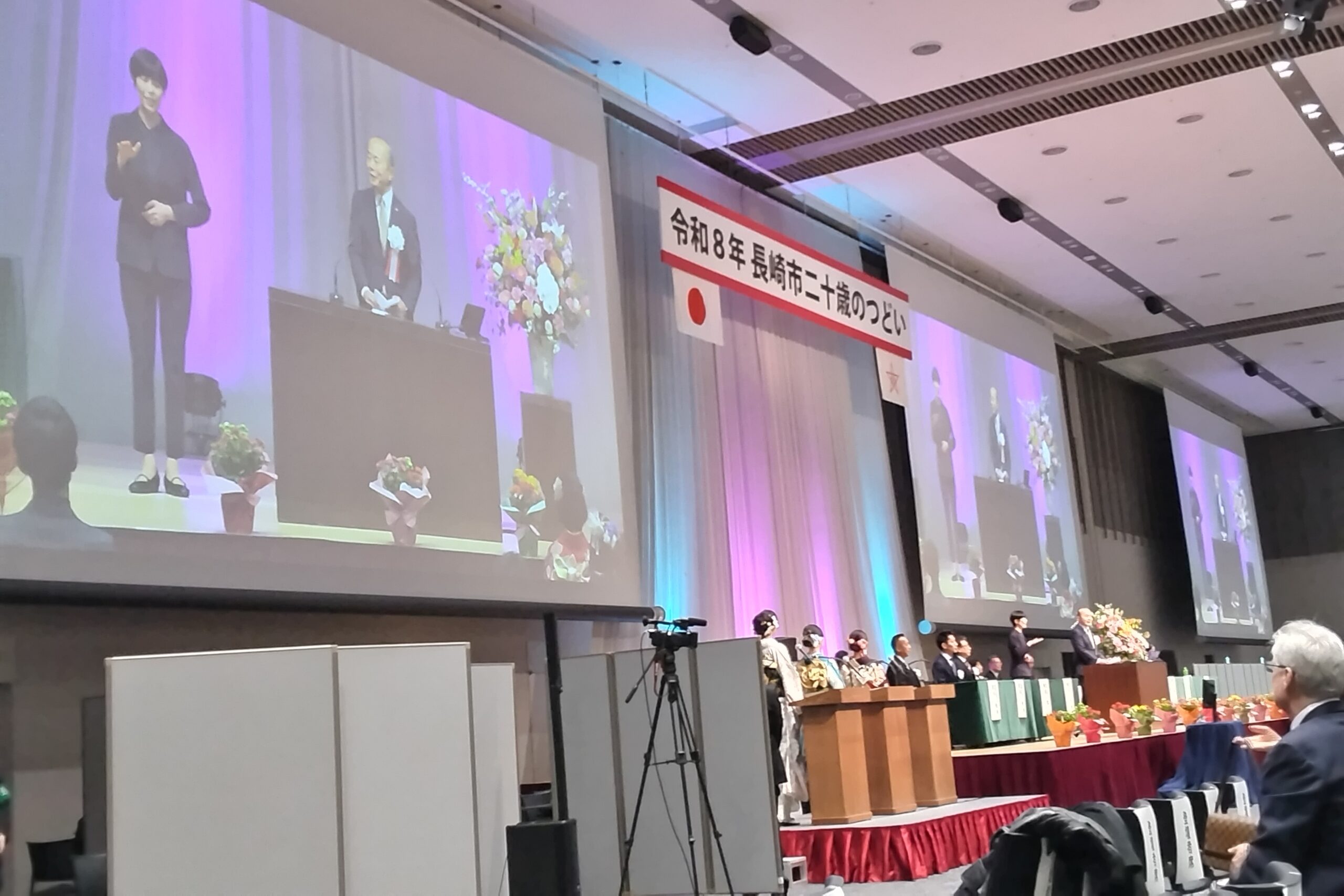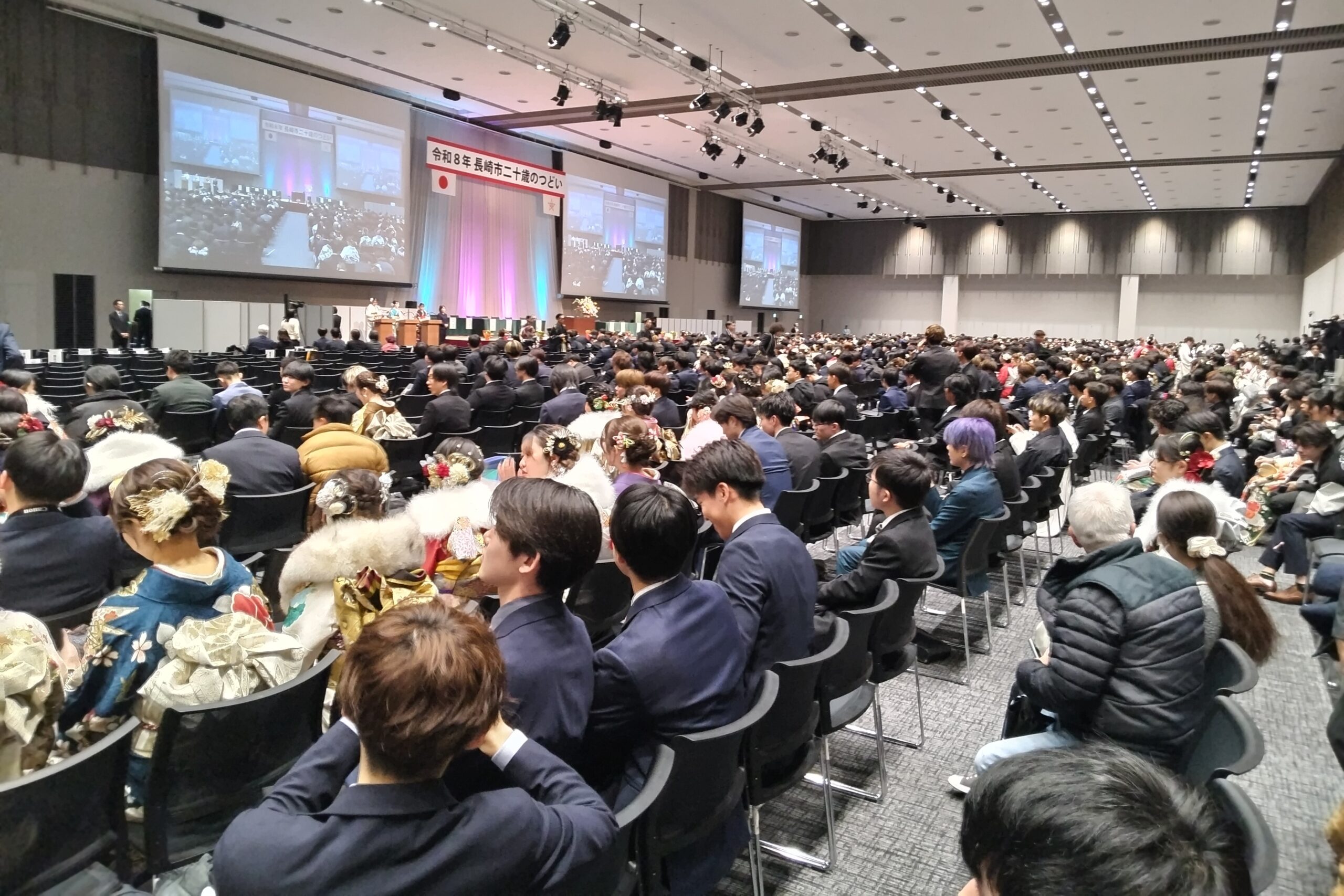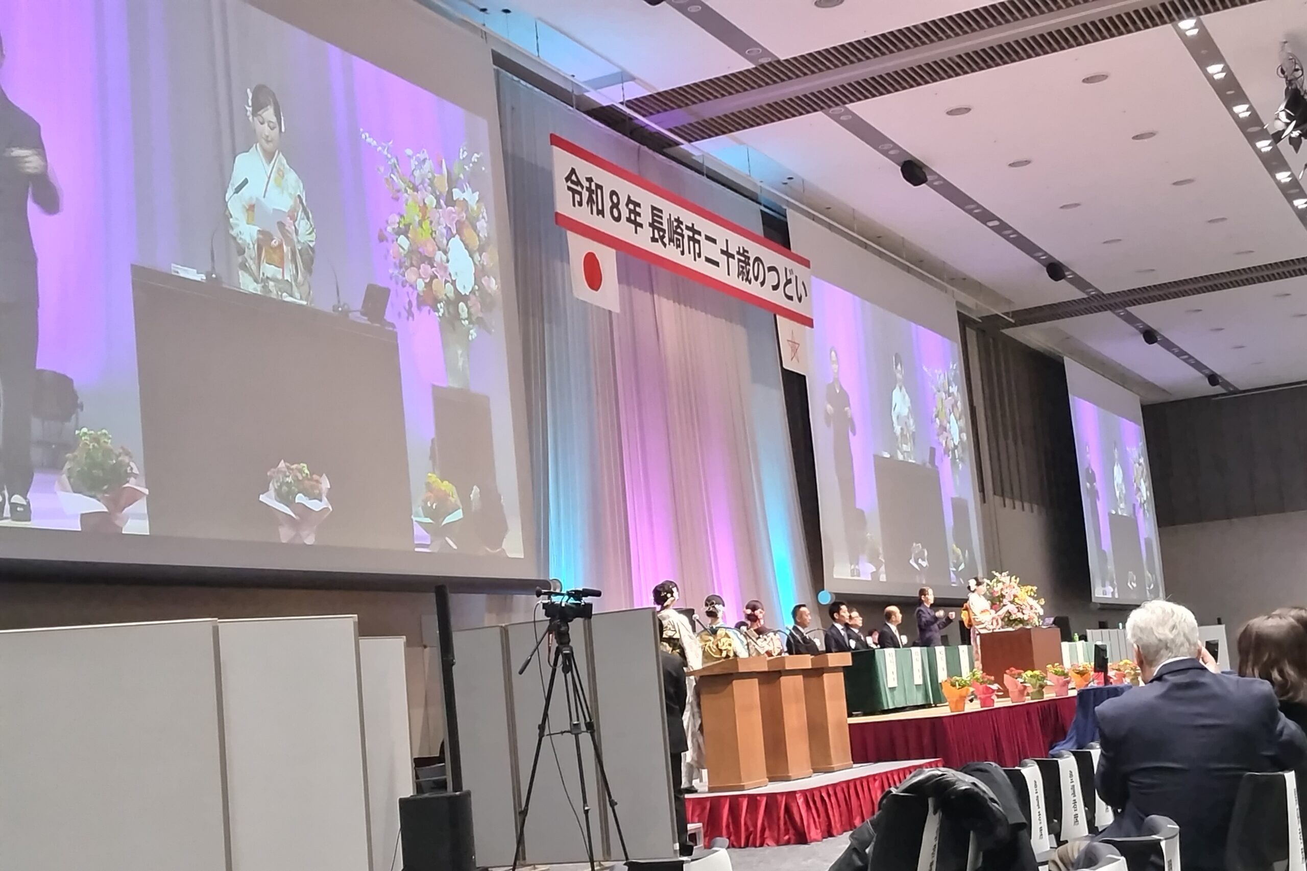 参列者を代表して長崎大2年のバンダービーン新愛さんより「長崎での平和教育を通じて命の尊さを学んだ。私たちだから守れる未来があり、大切に育ててもらった命を社会のために役立てていこう。大人としての自覚を胸に社会と誠実に向き合っていく」と誓いの言葉が述べられた。今年20歳を迎えるのは、2005年(平成17年)4月2日生まれから2006 年(平成18年)4月1日までに生まれた人。長崎市の対象者は3,337人(男1,689人、女1,648人)となっている。20年前には、市町村合併、県美術館や長崎歴史文化博物館が開館し、女神大橋も完成している。人口減少のなか、長崎の将来を担う若者の行動力と発想力、チャレンジ精神に大いに期待する。