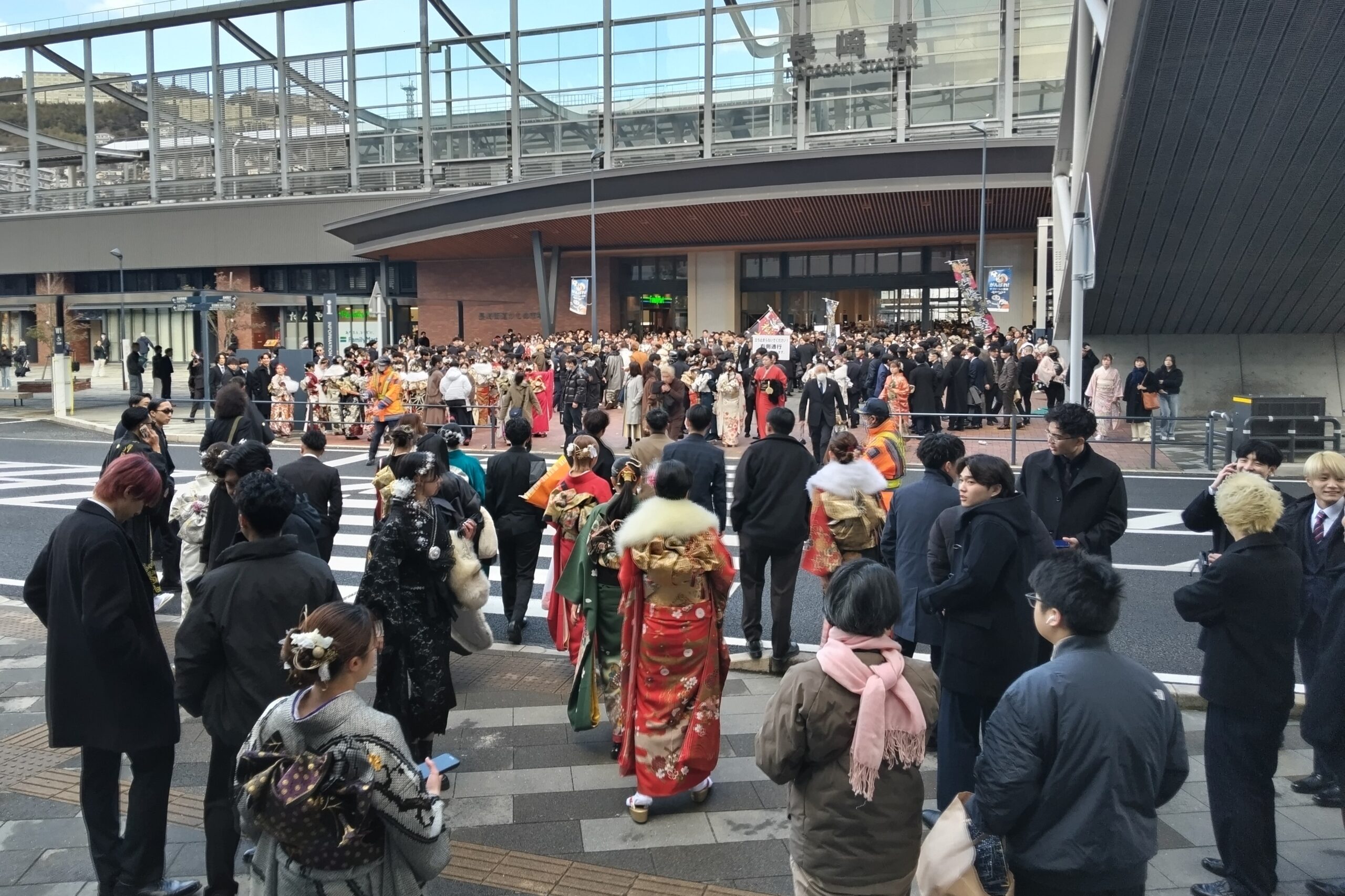 長崎市・長崎市教育委員会は、1月11日(日)15時から出島メッセ長崎において「令和6年長崎市20歳のつどい」を開催、雪が舞うなか約1,360人が参列した。長崎駅西口の出島メッセ長崎の入口付近には、新成人・ご家族・関係者らが集い、久方ぶりの再会と慶びを分かちあい、20歳の節目としての新たな一歩を踏み出した。この成人式は、平成9年度より新成人による実行委員会を設け、企画立案・周知啓発など新成人自ら取り組んでいる。式典では、鈴木市長より「長崎で学んだことは貴重な財産、時代の波にくじけそうなときは、これまでの経験や自分の可能性を信じて進み続けてほしい」、岩永市議会議長より「飛躍する節目である、ピース(平和)&ラブ(愛)で前に進んでほしい」との、励まし・お祝いの言葉が述べられた。