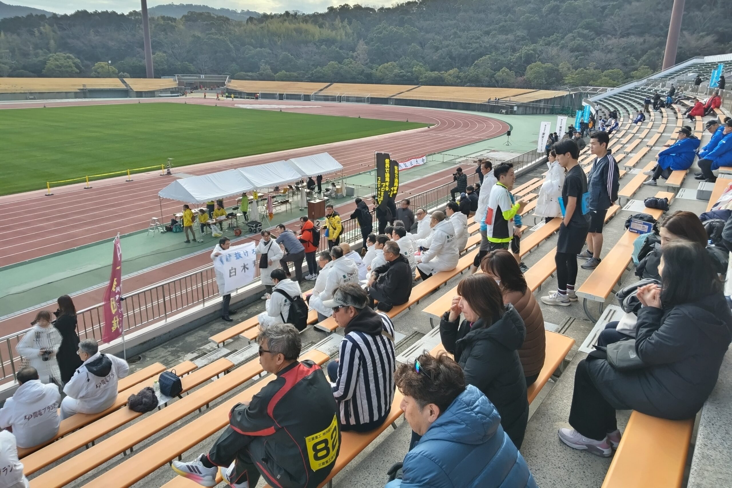 三菱重工(株)長崎造船所(藤田真所長)は、1月18日(日)10時からベネックス総合運動公園において造船所や関連・パートナー企業などを含め113チーム、約1,300人が参加して、職場の親睦を深め、健康増進を目的に新春恒例の「第77回三菱所内駅伝大会」を開催した。私(井上)が三菱長崎造船所に入所した当時の大会は、深堀地区(旧深堀グランド周辺)での開催、その後、諌早工場へと場所が変更、規模が大きくなったため香焼工場での大会、現在はベネックス総合運動公園で開催されている。久方振りに私(井上)も、西岡秀子衆議院議員とともに三菱重工労組長船支部チームや職域チームの応援に駆けつけた。重工労組チームには、生活相談室中村室長(県議会議員)も元気に健脚を競っていた。