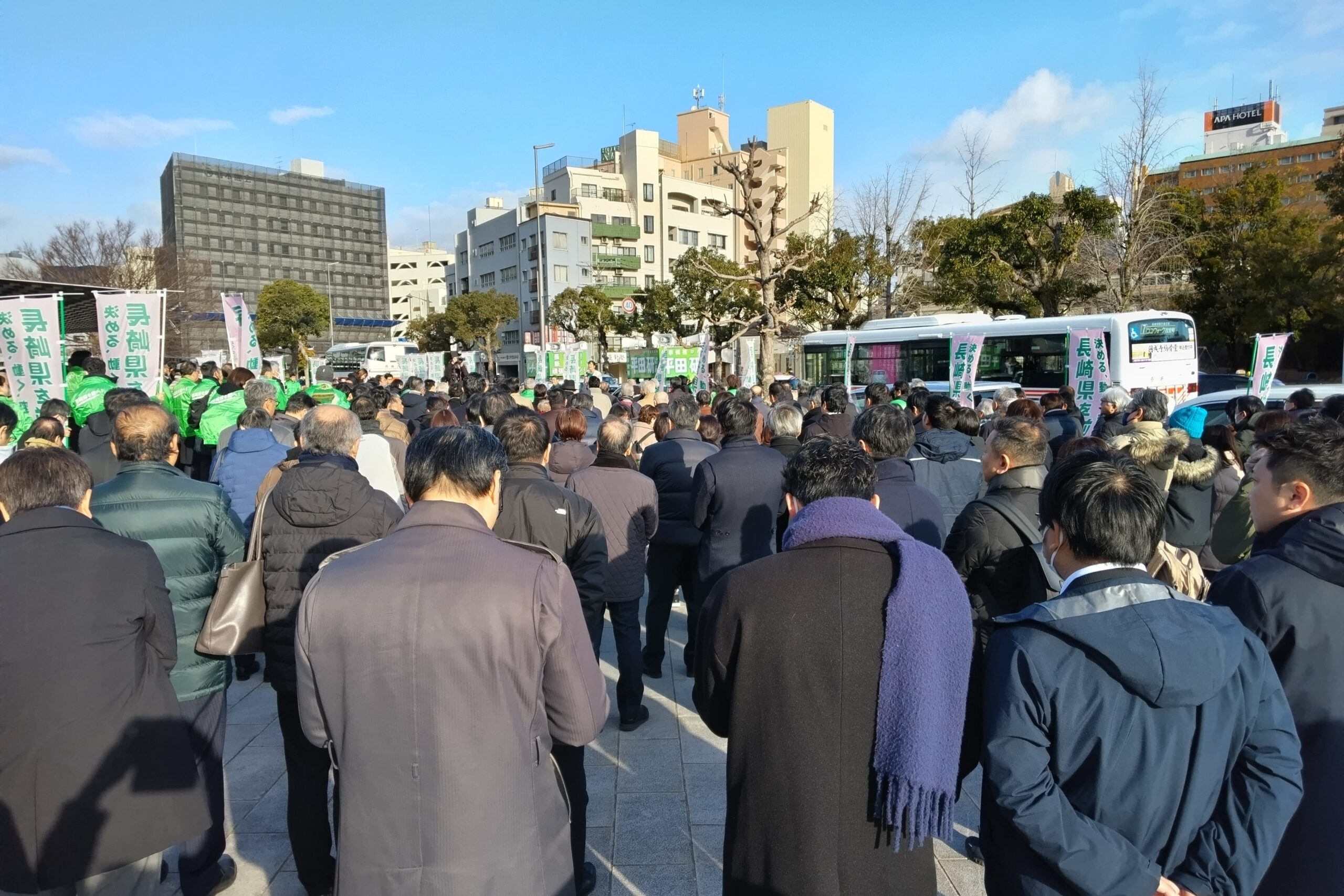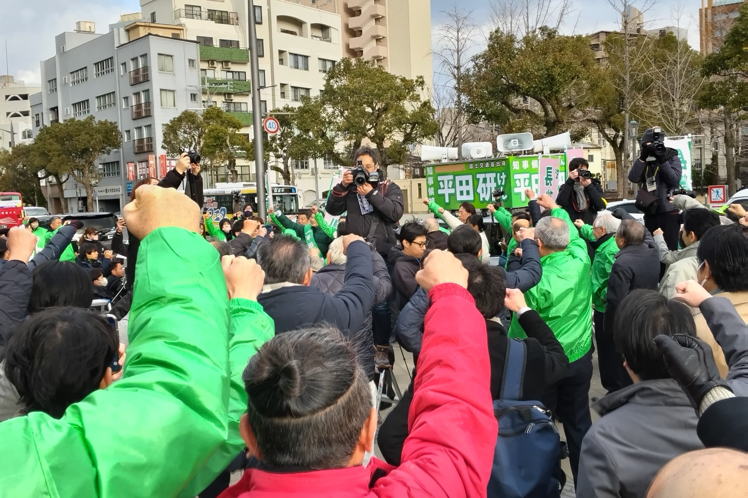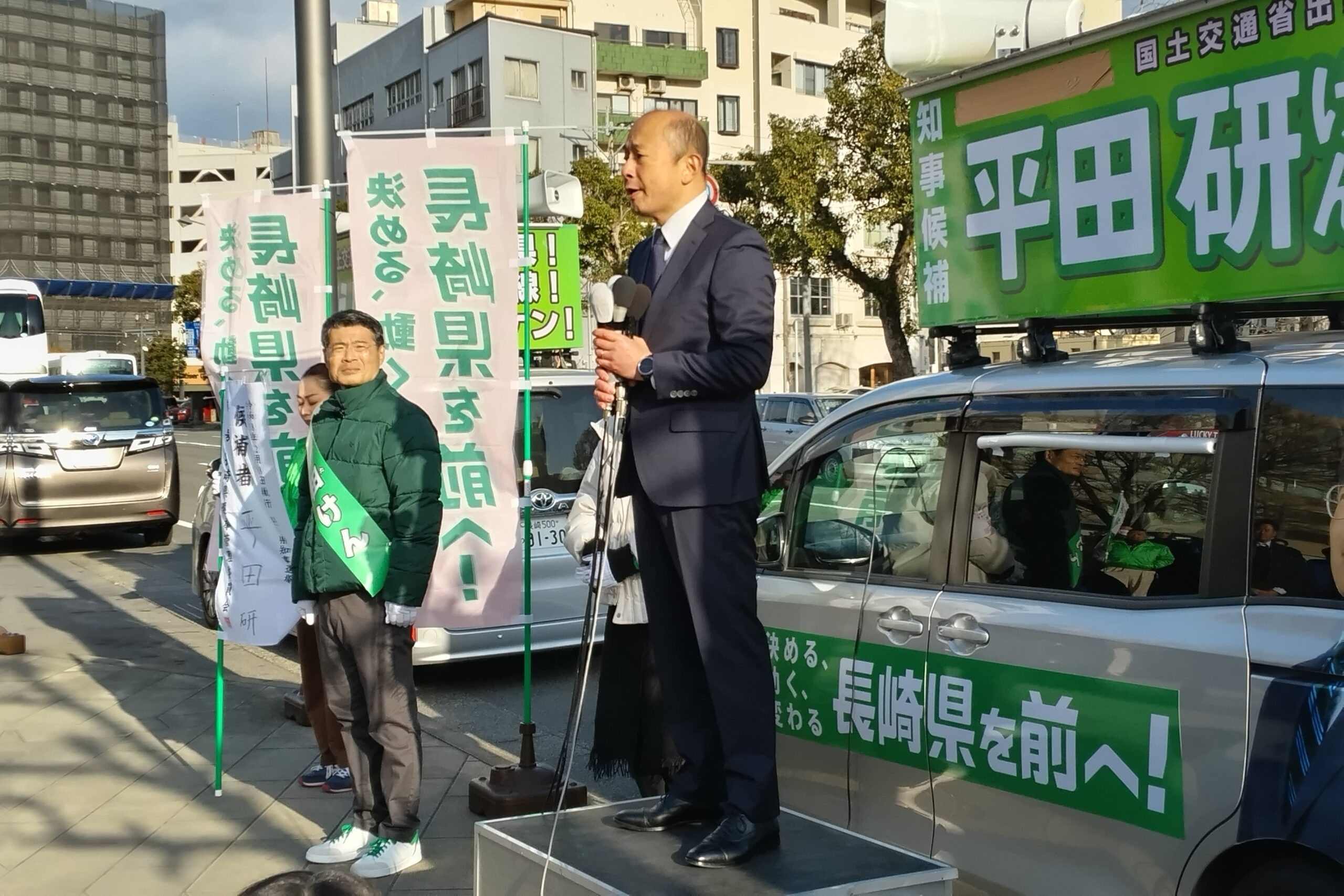 応援弁士からは、長崎の未来を託すのは“平田研”であり「かつけん、がんばるけん“平田研“」をよろしくお願いする。長崎鈴木市長より国土交通省の仲間であった平田研候補、長崎県を前に進めるため、覚悟を決めて応援するとの挨拶があった。平田研候補より「長崎で生れ育てられた、長崎県を前に進めるため、覚悟を決めて戦いに臨む挑戦者である。長崎県は人口減少を迎えているものの、経済のパイを縮小させない、安心して暮らすことのできる地域を残し、人を育てて行きたい。県政への新たな信頼をつくり、未来の長崎の希望をつくるなど」決意の一端が述べられた。県選管によれば、県内の有権者は1月21日現在、106万3413人(男49万6145人、女56万7268人)となっている。