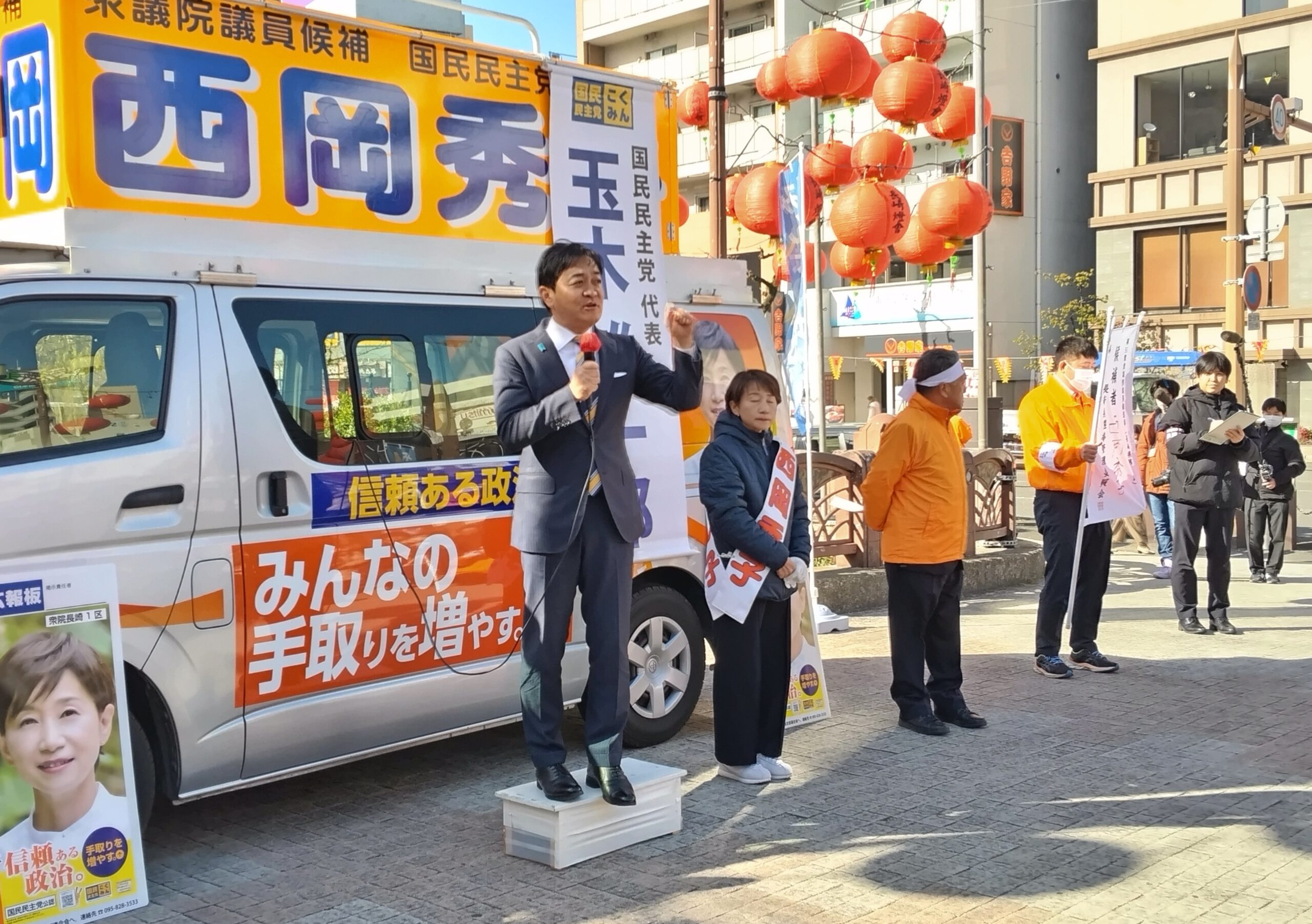 次に、28日長崎入りした玉木代表は、「国民生活最優先の新しい政治に日本の政治を変えていきたい」、国民民主党が掲げた政策が少数与党下で実現したことを踏まえ「あたらしい政治の流れを止めないで」と訴えた。物価高騰の中、「住民税の控除額を178万円に引き上げる」など“もっと手取りを増やす”政策の実現を目指すと主張した。国民民主党は、今回の総選挙も引き続き「手取りを増やす」を掲げるとして、社会保険料の負担軽減や電気代の引き下げなどを通して、暮らしの底上げを目指すとアピールした。西岡秀子候補は、「与野党が伯仲する国会だからこそ、掲げた政策を一定実現できた」、「国民のための政策を前に進めるためのエンジンとなり、国民のための政治をつくりだしていく」と訴えた。
