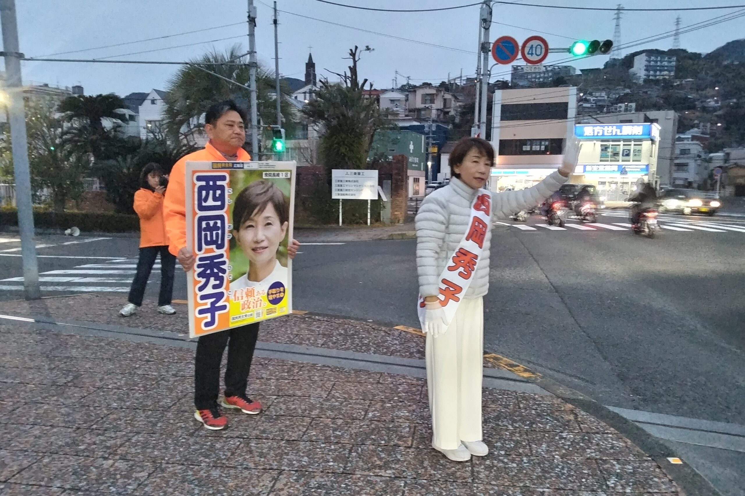 第51回衆院議員総選挙の戦いは最終日を迎え、西岡秀子候補は働く者の代表として、長崎を想い、我が国の課題・長崎の課題に取り組み「手取りを増やす政策」を、次世代に希望ある未来を引き継ぐため、政治に信頼を取り戻し、この国の在り方を本気で変えていくと訴えてきた。最終日の西岡秀子候補の行動は、宝町交差点での朝の挨拶、午後からはココウオークでの街頭演説を皮切りに、モモタロー行動を行い、夢彩都、AOKI前付近での街頭演説、19時45分から西岡秀子選挙事務所前でマイク納め式を行う予定となっている。まちなかでは、冬を彩る「長崎ランタンフェスティバル」が6日、新地中華街やアーケード、中島川周辺で開幕した。トリプル選挙最終日、雨にも負けず頑張ろう!